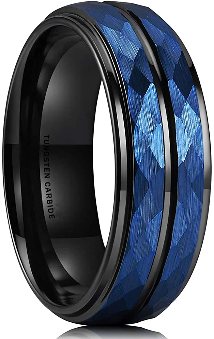A hammered tungsten carbide black two-tone wedding band is a safe, durable, and stylish choice for daily wear.