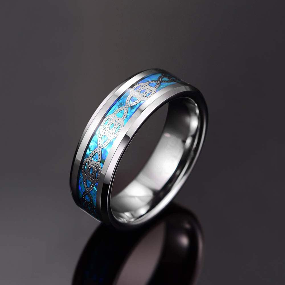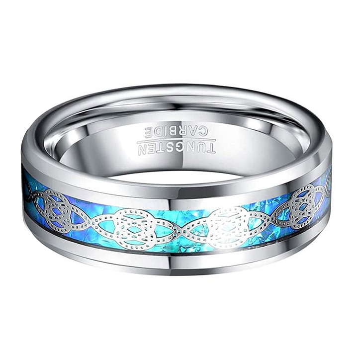 That sounds like a description of a particular style of men's wedding band. The ring is made of tungsten carbide, a strong and durable material often used in jewelry, and features a Celtic knot design with a blue opal sticker inlay. The ring is 8mm in width, which is a popular size for men's wedding bands.