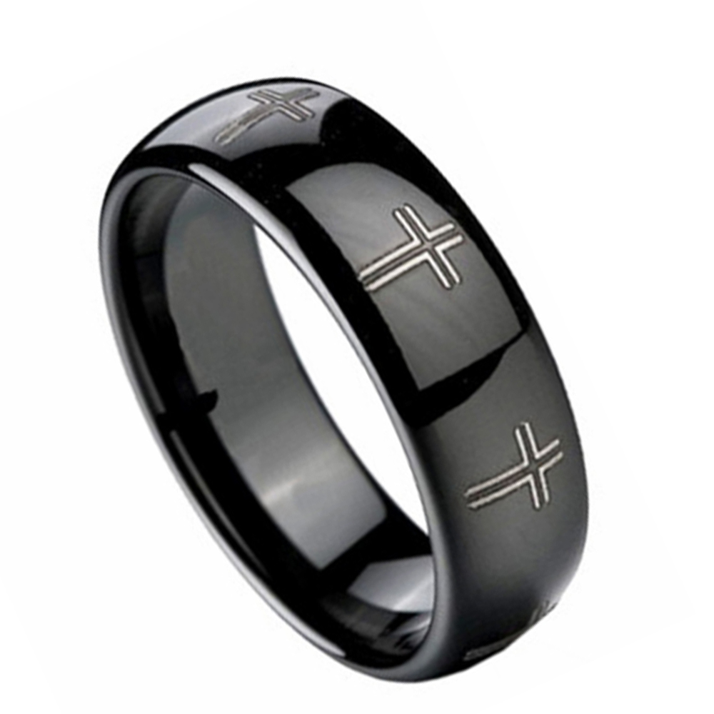 This tungsten carbide ring inblack color,8mm width with a logo flat christian cross engraved on it.As the traditional wedding season is quickly approaching,many soon-to-be-weds will be in the process of planning their upcoming wedding ceremony,and with a majority of ceremonies taking place in a religious setting or theme,catholic tungsten wedding bands and cross rings are the preferred choice of couples.