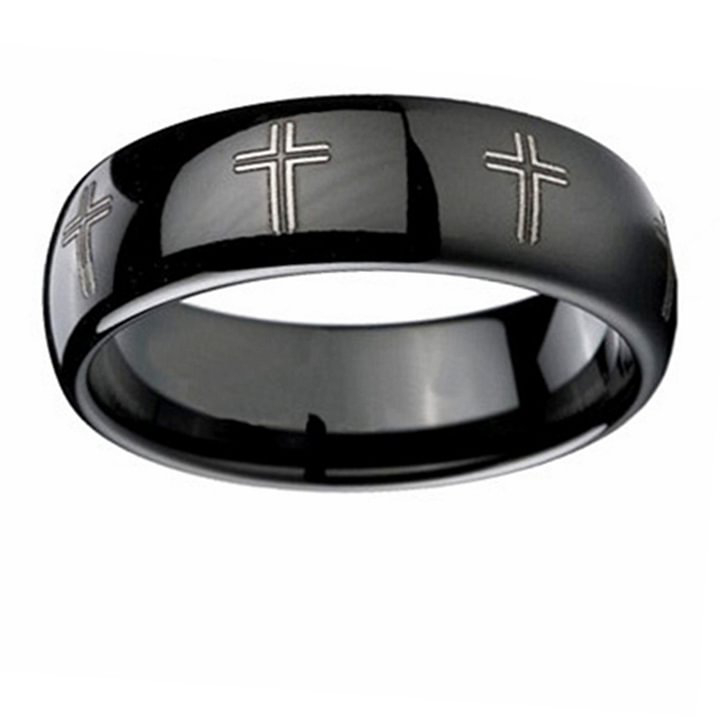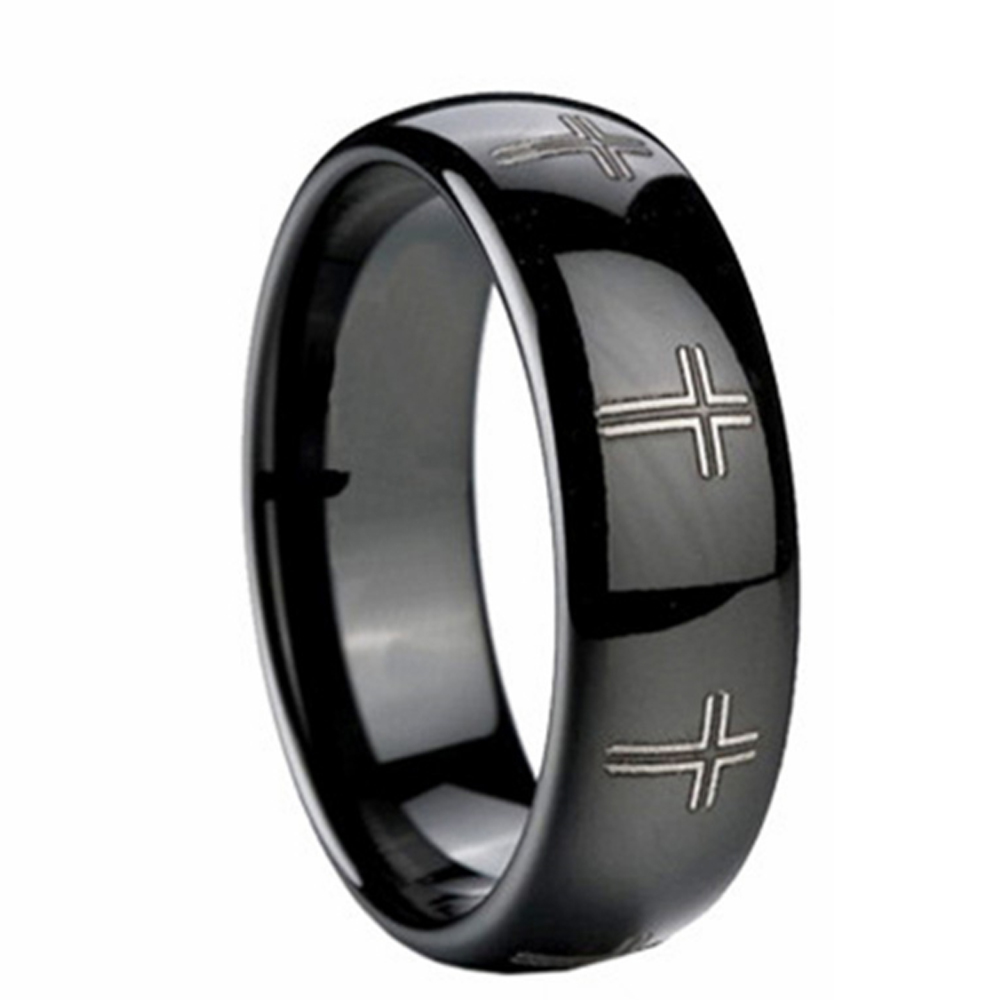 A men's cross religion Wedding Rings For Men with a black full arc tungsten wedding band can be a meaningful and stylish choice for a wedding band or everyday wear. Tungsten is known for its durability and scratch resistance, making it a great option for those who lead an active lifestyle or work with their hands. The black full arc design gives the tungsten rings for sale a modern and masculine look, while the cross symbol adds a touch of religious significance to the design. The cross symbol on the ring can represent a person's faith and values, making it a meaningful and personal choice for a wedding band or everyday wear. The black full arc design creates a unique and modern look, making it suitable for those who want a contemporary style.