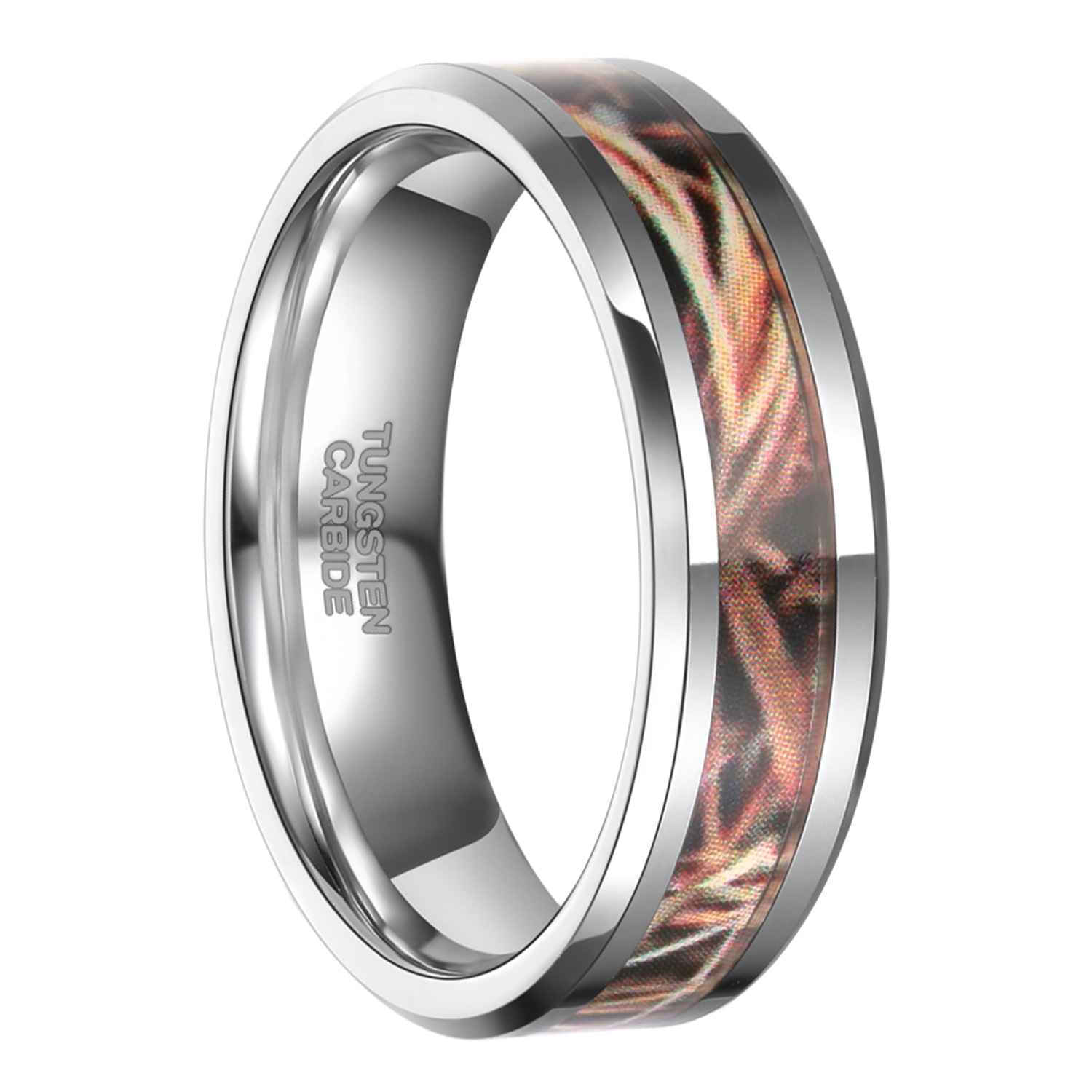 Step into style with this tantalizing blend of tungsten.Black plated beveled edge.Camouflage inlay is the perfect backdrop for the ring.A clean and classic style, Tungsten Carbide Rings are quickly taking the place of white gold and platinum as the preferred wedding band.