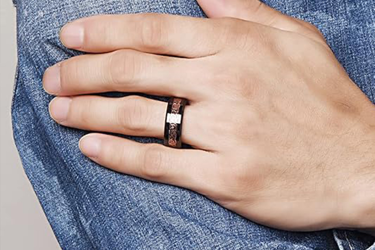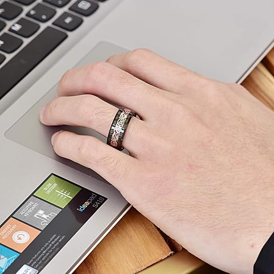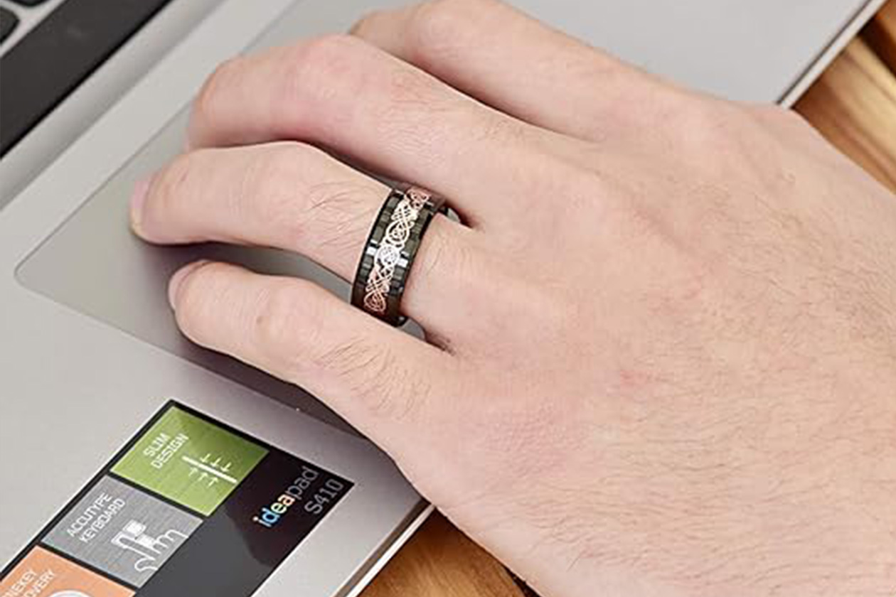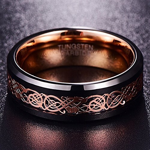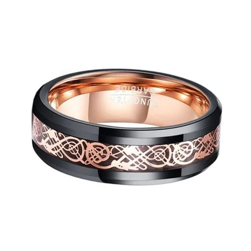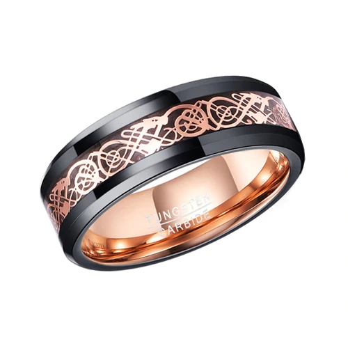 A gold tungsten rings for men with a black and rose gold Celtic dragon knot design and resin inlay can be a striking and unique choice for both men and women. Tungsten carbide is a durable and scratch-resistant material that is well-suited for everyday wear, making it a popular choice for wedding bands. The Celtic dragon knot design symbolizes strength, wisdom, and loyalty, and is often associated with Celtic mythology and culture. The black and rose gold color combination adds a modern and stylish twist to the traditional Celtic knot design. The resin inlay can add a touch of color and texture to the ring, while the rose gold inside tone can provide a subtle contrast to the black and rose gold exterior. This combination of design elements can result in a visually striking and memorable wedding band.