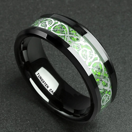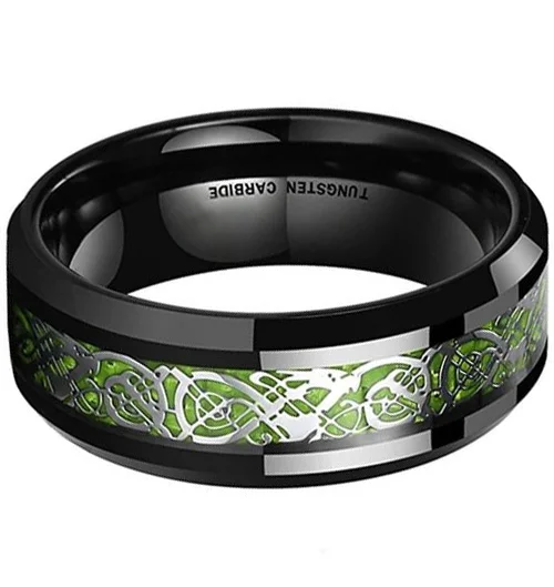 the Black Resin Inlay Silver and Bright Green Celtic Dragon Knot Tungsten Carbide Wedding Band Rings appear to be a unique and eye-catching choice. The combination of black resin, silver, and bright green creates a striking contrast that can make for a memorable and stylish wedding band.