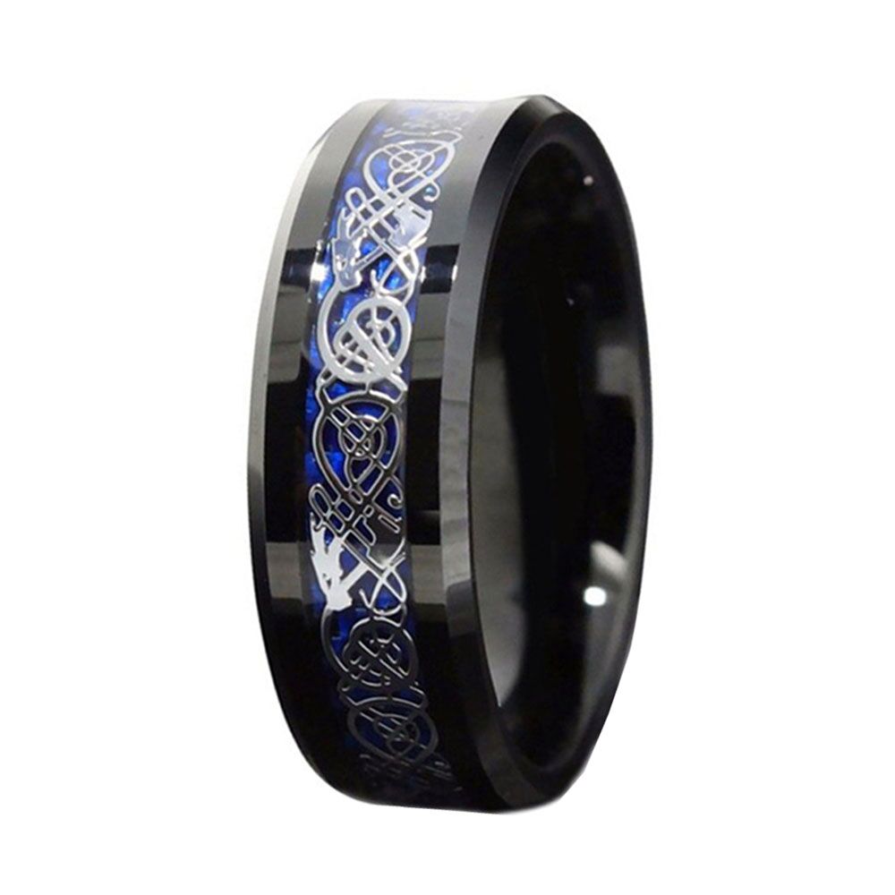 8MM Black tungsten rings for sale Inlay Blue Carbon Fiber Dragon Pattern Wedding Bands are a popular choice for those who want a unique and bold wedding band. The rings are made of tungsten, a strong and durable metal that is ideal for daily wear.