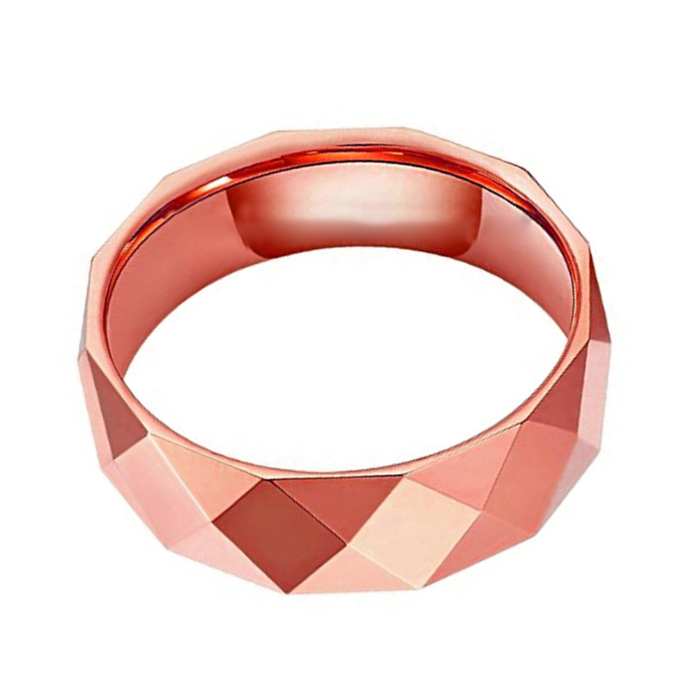 This multy faceted tungsten ring is plated rose gold and geometric cut.It can be used as engagement,wedding bands and daily wearing.This beautiful rose gold tungsten ring is 8MM in width. It is beveled high polish finish with diamond shaped faceted design.If you are looking for a ring that is scratch proof and forever keep its shine,than our tungsten carbide rings are for you.His And hers tungsten wedding band set,tungsten promise ring set.