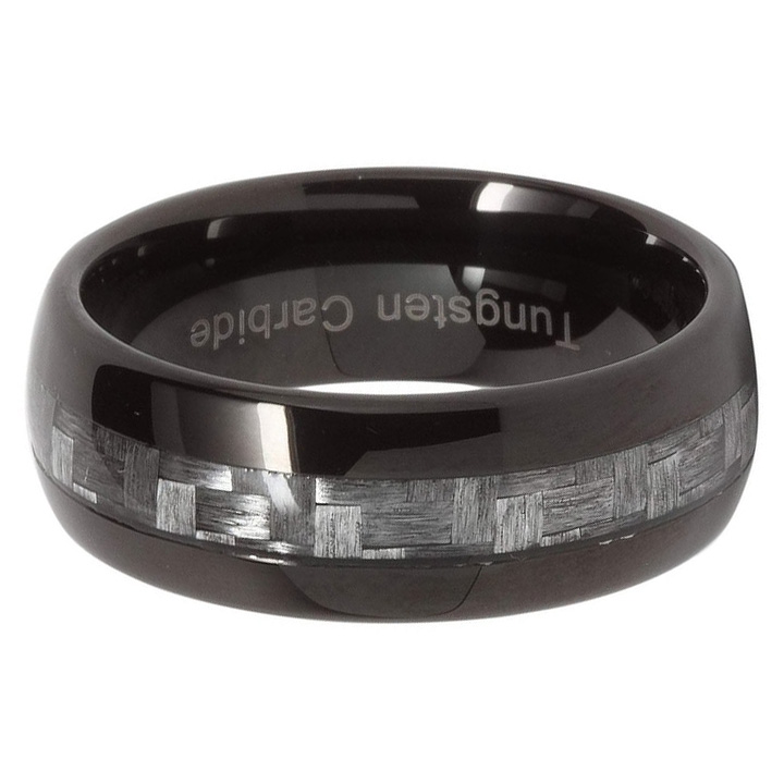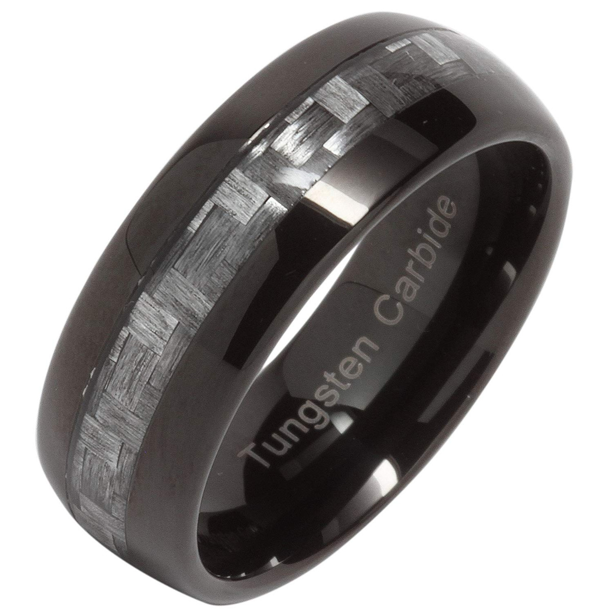 The Tungsten Wedding Bands have a gray carbon fiber inlay, which adds a unique and modern touch to the design. The carbon fiber inlay is complemented by the black tungsten, which creates a sleek and sophisticated look.