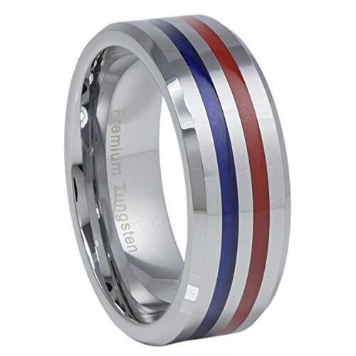 Women's Or Men's Tungsten Carbide Wedding Band Matching Rings,Silver Bands with Blue And Red Line Stripes,High Polish Finish And Beveled Edges Ring With Mens And Womens For Width 4MM 6MM 8MM 10MM