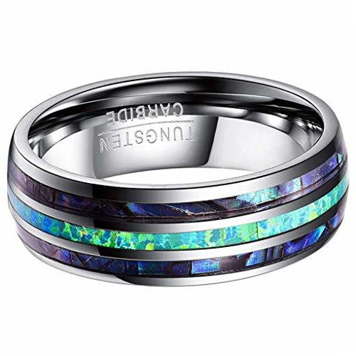Women's Or Men's Tungsten Carbide Wedding Band Matching Rings,Silver Tone Multi Color Blue/Green Opal and Rainbow Abalone Shell Inlay Ring Organic colors With Mens And Womens For Width 6MM 8MM