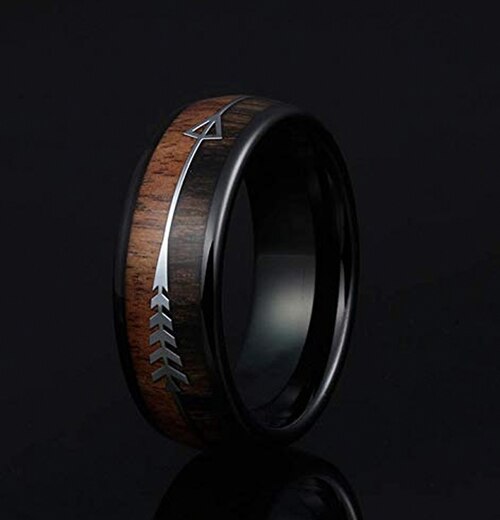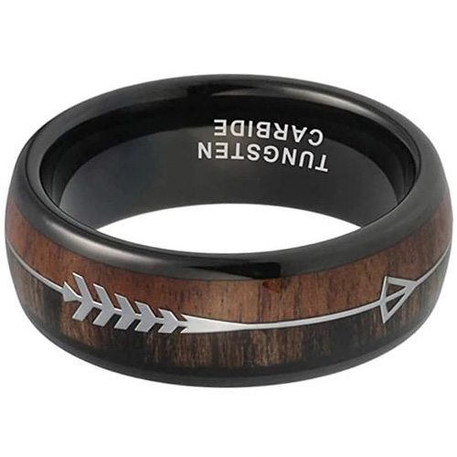 Tungsten carbide wedding bands with black Cupid's arrow over wood inlay, domed top and high polish finish are a popular choice for both men and women. These rings are durable, scratch-resistant, and hypoallergenic, making them a great choice for those with sensitive skin or who work with their hands.
