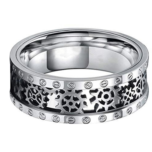 The cut-out silver mechanical gears and bolts add a touch of industrial style to the ring, making it stand out from traditional wedding bands. The ring is available in different widths ranging from 4mm to 10mm, allowing you to choose the perfect size that suits your style and comfort.