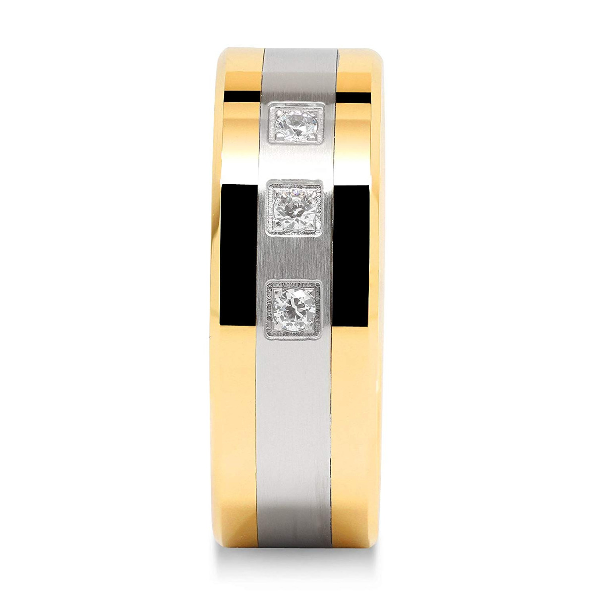 The Mens Women Tungsten Ring for Men Womens Gold Silver Crystal Wedding Bands Two Tone 3 CZ Stone Promise Marriage Couple Rings are beautiful and elegant rings suitable for wedding bands or promise rings. The two-tone design of gold and silver adds a touch of luxury to the ring, and the three CZ stones give it a stunning sparkle.