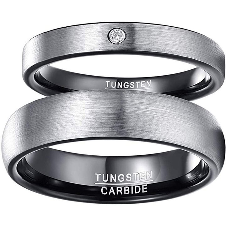 The Mens Womens Duo Tone Black Matte Silver Tungsten Carbide Rings for Men Women Brushed Finish Couple Wedding Band Sets Comfort Fit Ring is a beautiful set of rings that come in different widths to accommodate personal preferences. The silver wedding rings feature a brushed finish with a black matte center and silver edges. The tungsten carbide material ensures durability and scratch resistance. The set is designed as a matching couple's wedding band set, making it a perfect symbol of your love and commitment. The comfort fit design adds to the comfort of wearing the ring throughout the day.
