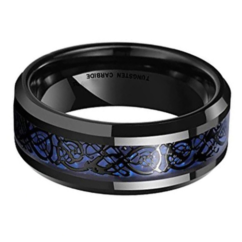 Overall, a tungsten carbide wedding band with a Celtic dragon knot design and black with blue resin inlay can be a unique and stylish choice for a couple's wedding band. Consider the design, fit, comfort, and vendor reputation when selecting a tungsten carbide wedding band for long-lasting wear.