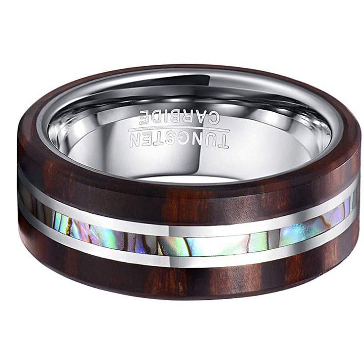 Wood and abalone shell inlay tungsten carbide matching rings can be a beautiful and unique choice for a couple's wedding band. The combination of natural materials like wood and shell with the durability and strength of tungsten carbide creates a stunning and long-lasting Inlay Tungsten Rings women.