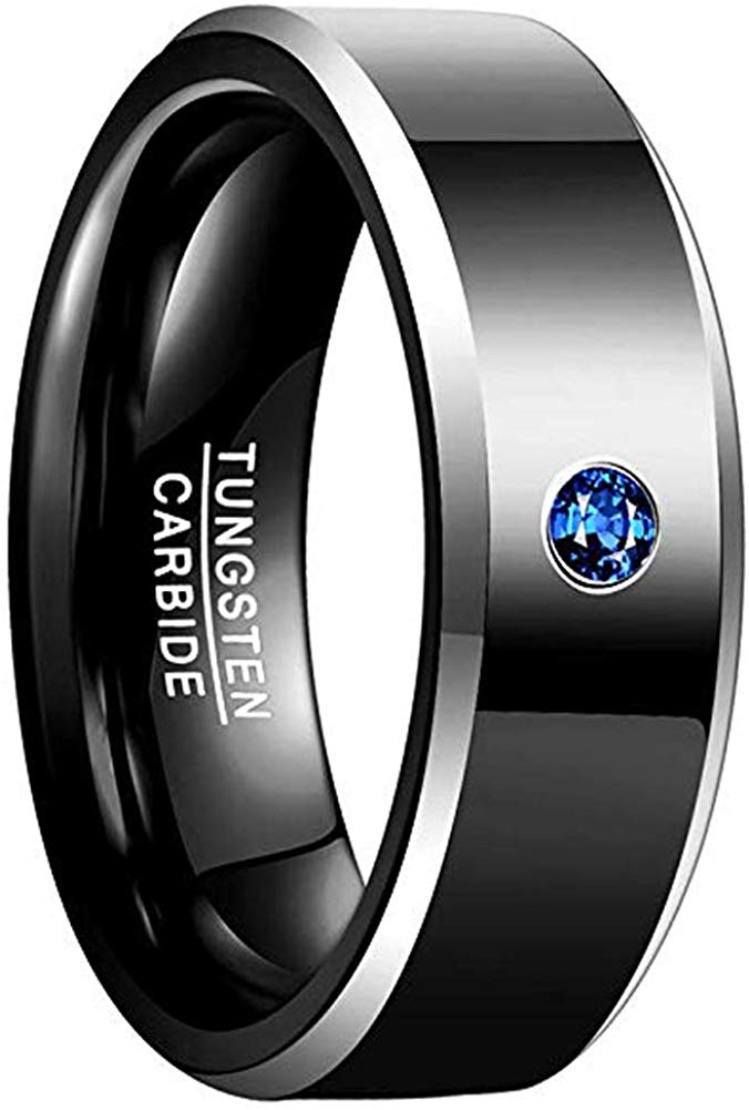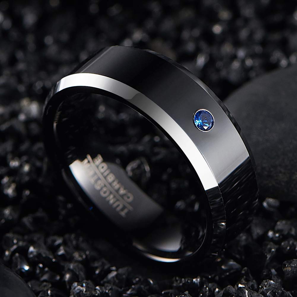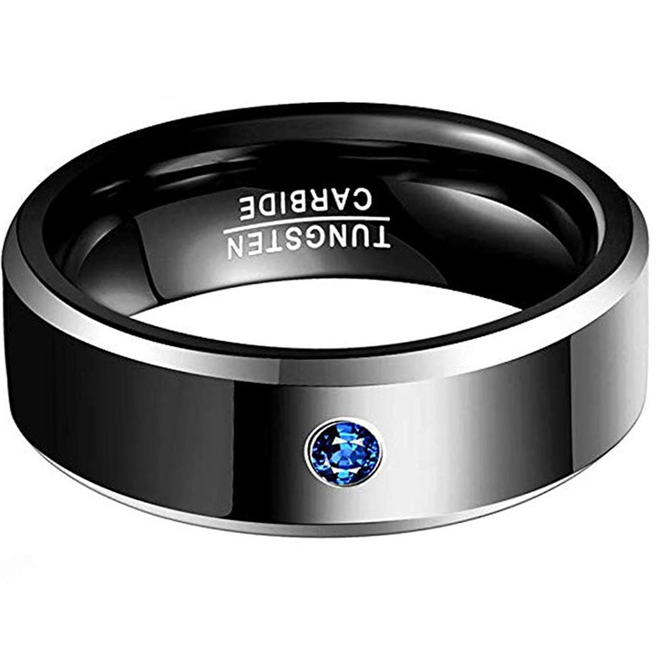 High polished black tungsten rings, inlaid with a shiny blue CZ, giving it an eye catching and fashionable look.