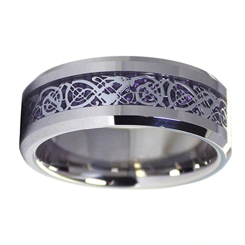 The Tungsten Carbide Men's Women Black with Purple Celtic Dragon Knot Wedding Rings Band with an outer silver resin inlay and purple Celtic knot design sounds like a unique and visually striking choice for a wedding band. The Celtic knot design is a popular symbol of infinity, with no beginning or end, and can represent eternal love and commitment in a marriage. The addition of the purple color can add a pop of color and individuality to the Tungsten Wedding Bands. It's important to note that tungsten carbide women tungsten rings are known to be on the heavier side, so if you or your partner are sensitive to weight or prefer a lighter ring, this may not be the best choice.