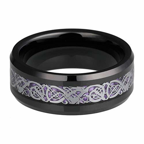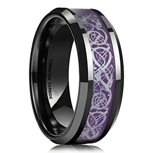 The Women or Mens Tungsten Carbide Wedding Ring Band with a Black Resin Inlay with Purple and Silver Celtic Dragon Knot is another visually striking and unique choice for a wedding band. The Celtic dragon knot design is a symbol of strength, power, and good luck, and can represent the bond and commitment between partners in a marriage. Overall, if you and your partner are drawn to the unique design and symbolism of the Women or Mens Tungsten Carbide Wedding Ring Band with a Black Resin Inlay with Purple and Silver Celtic Dragon Knot, and are comfortable with the weight of Tungsten Rings, it could be a great choice for a wedding band that combines both style and meaning.