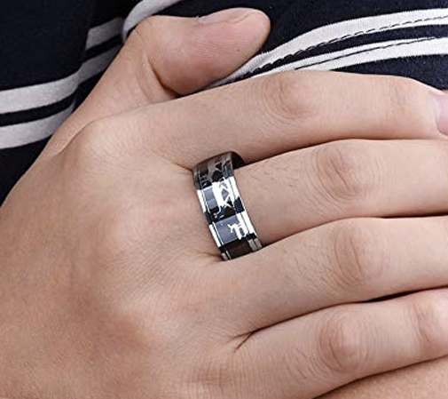 The Tungsten Men's Hunting Ring Deer Crossing Wedding Band is a great option for those who love hunting or the outdoors. The silver tungsten band features a deer silhouette over wood, creating a unique and rustic look that is perfect for the avid hunter or outdoorsman. The deer silhouette over wood design is a great way to showcase one's love for hunting or the outdoors, making it a perfect wedding band for the avid hunter or outdoorsman. The silver tungsten band adds a touch of elegance to the men tungsten ring, making it a great choice for those who want a unique and rustic wedding band without sacrificing style.