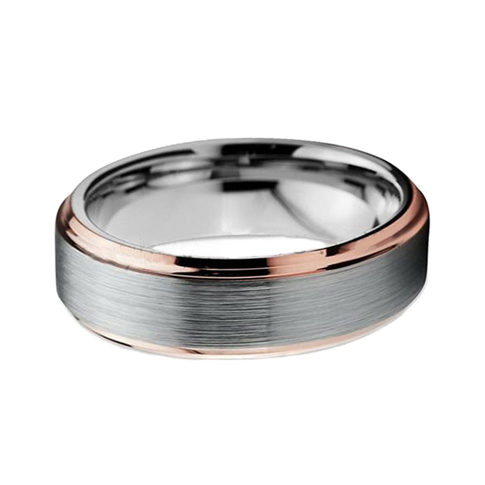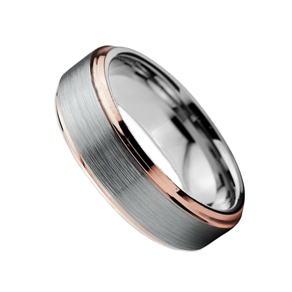 Tungsten Wedding Band Rose Gold Brushed Gunmetal finish High Polished Rose Gold Beveled Edges Ring .This stunning ring is designed with High Polished Interiorwhere rose gold meets silver brushed tungsten.This serves well for men or women, and makes a fantastic matched wedding band set. Available in 5mm to13mm size.