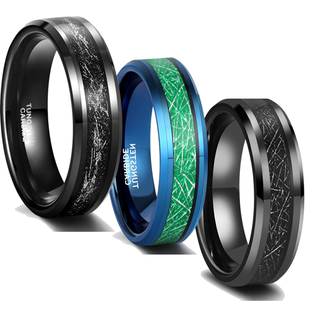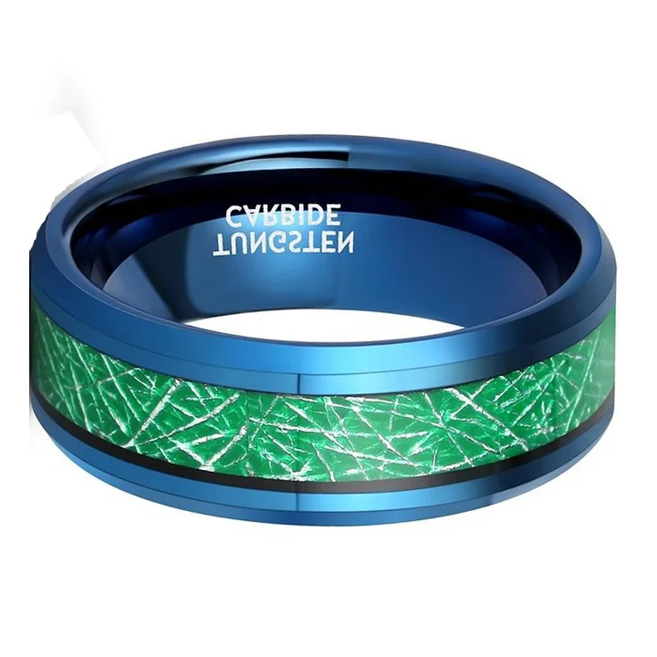 8mm wedding rings for men or women. green imitated Meteorite inlay tungsten ring with navy blue plating, weighty and durable