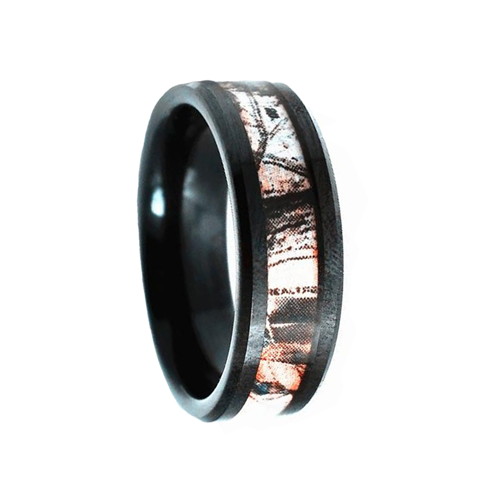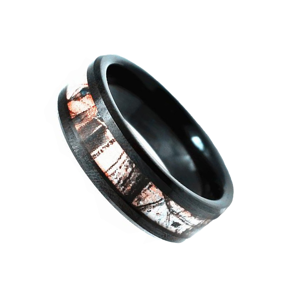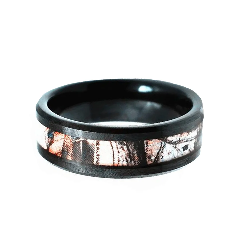 Step into style with this tantalizing blend of tungsten.black plated beveled edge.He camouflage inlay is the perfect backdrop for the ring.A clean and classic style,tungsten rings are quickly taking the place of white gold and platinum as the preferred wedding band.