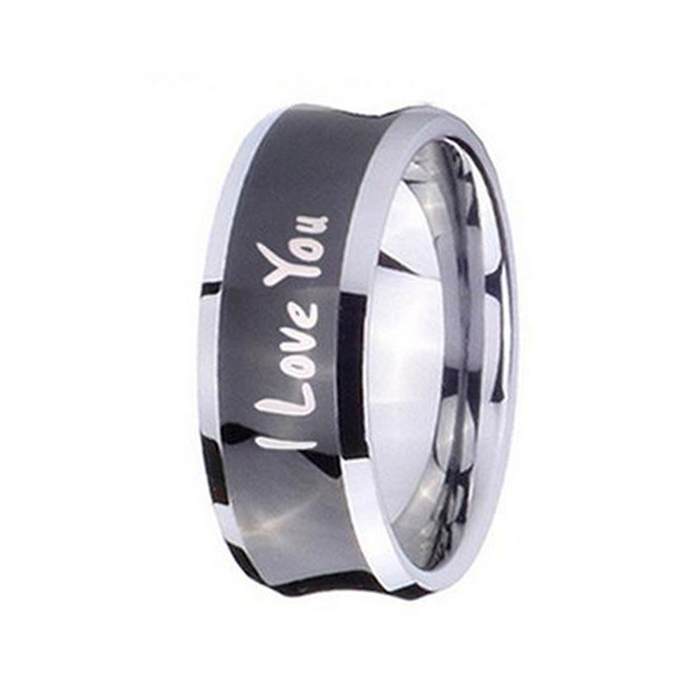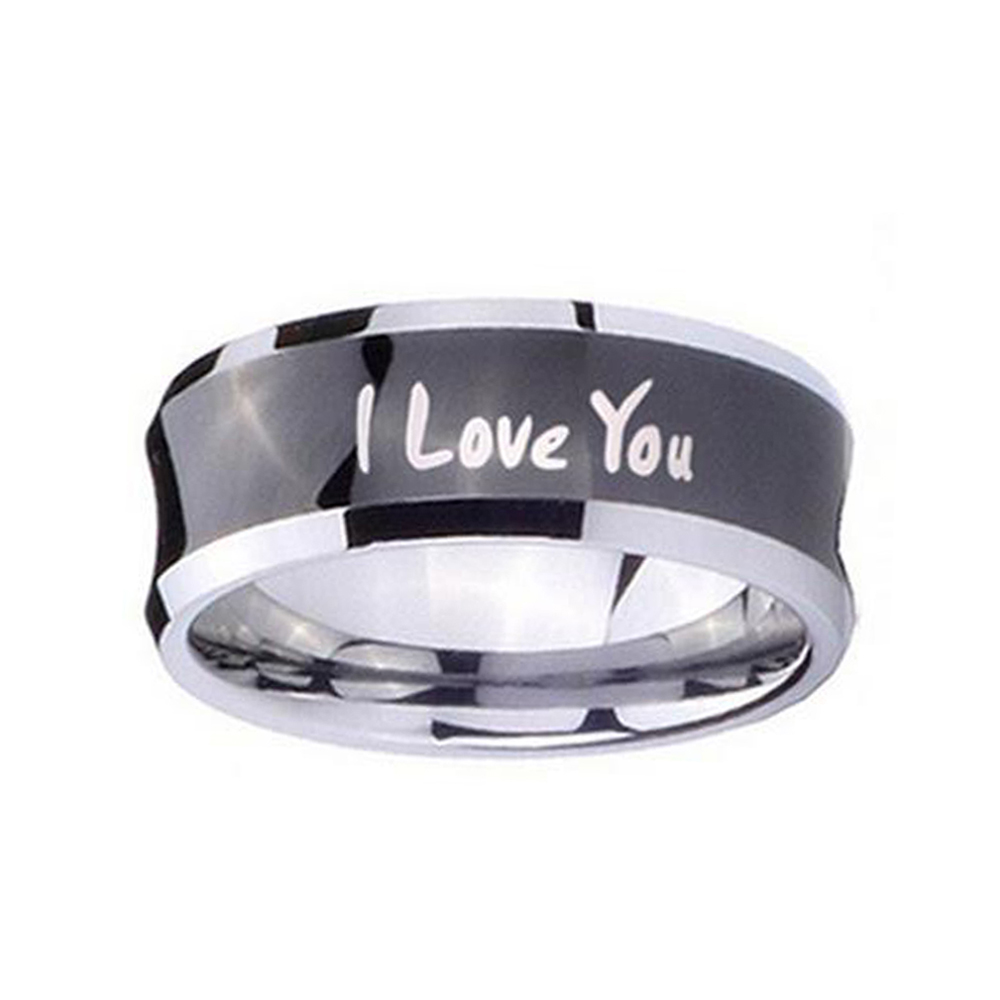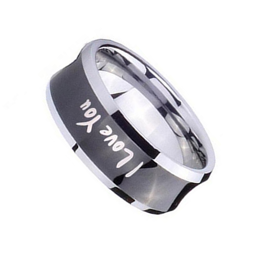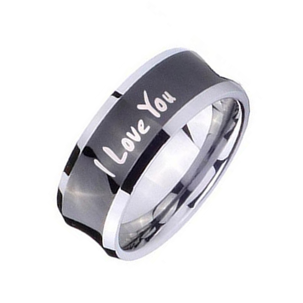 This tungsten carbide ring in black color,8mm width with a logo "i love you" engraved on it.This tungsten ring is cobalt free to avoid allergies, high polish finish,comfort fit design, perfect for the one you love.We can customize logo from your own design,email us and we can make for you.