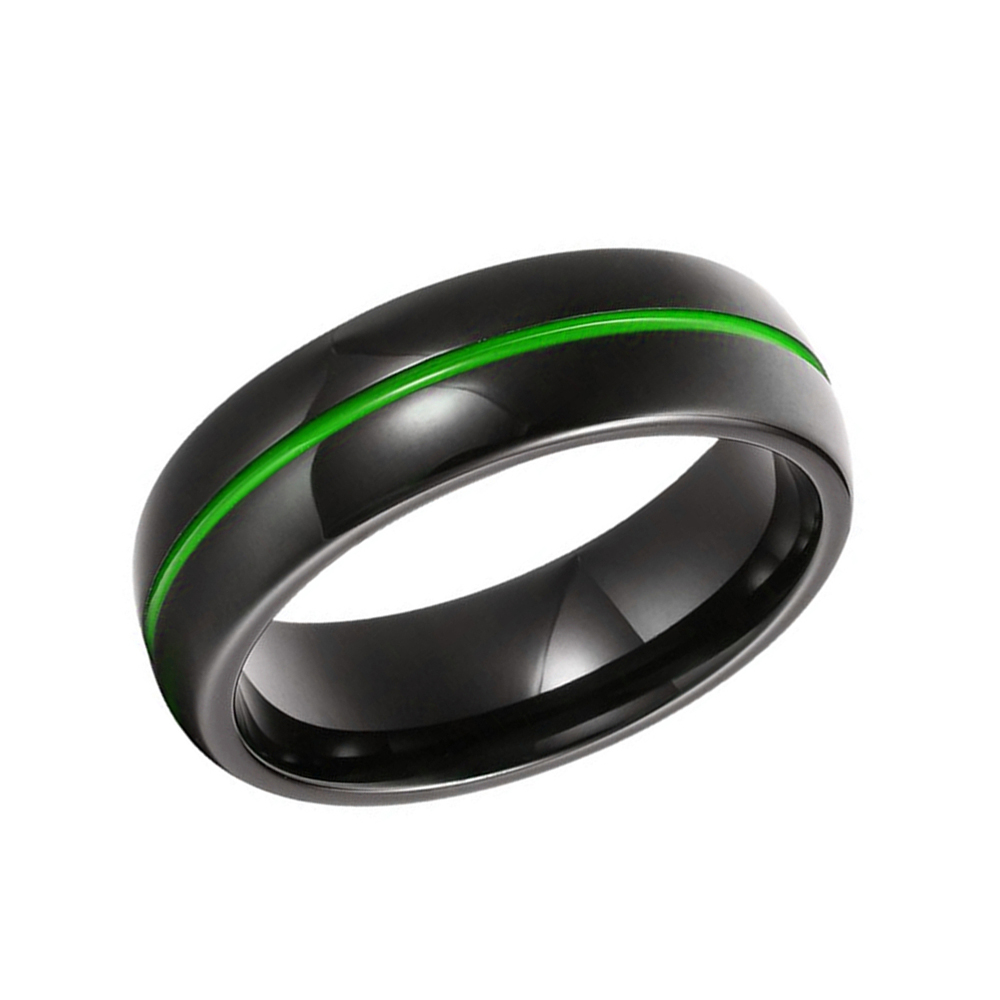At a glance,this tungsten ring demands attention.It features a bright,acid green groove which divides the center in two.Black plated,the smooth black surface of the ring adds the perfect contrast to the vibrancy of the splash of color.Inside, the ring boasts the same black hue,its polished finish adding a luxurious accent to the design.Beveled edges enhance the elegance of the ring further