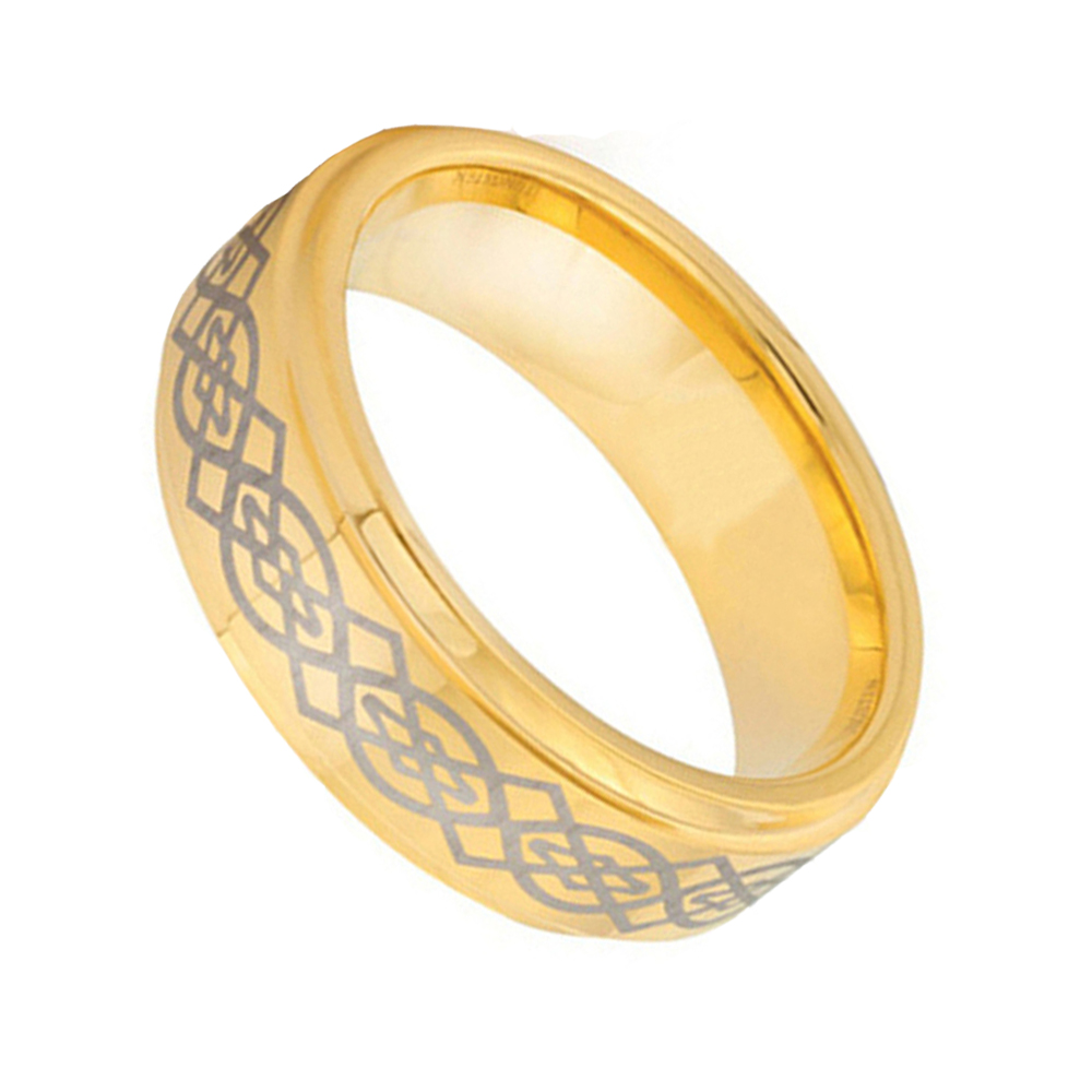 8MM Gold Laser Tungsten Rings Wedding Band is perfect for a bride or groom and it offers affordable luxury without appearing fake.Here is a beautiful matching wedding band set that includes a 8mm tungsten ring.Laser engraved tungsten ring has an ancient celtic pattern,which symbolizes never ending love.