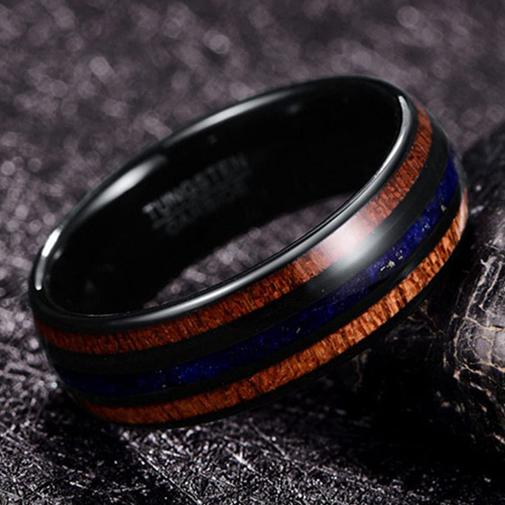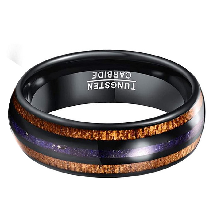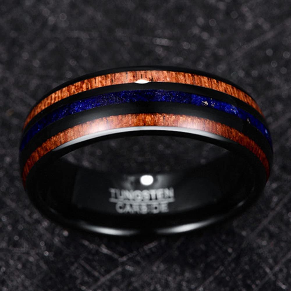 8mm Hawaii Koa Wood And Purple Lapis Lazuli Inlay Black Tungsten Carbide Men's Wedding Bands