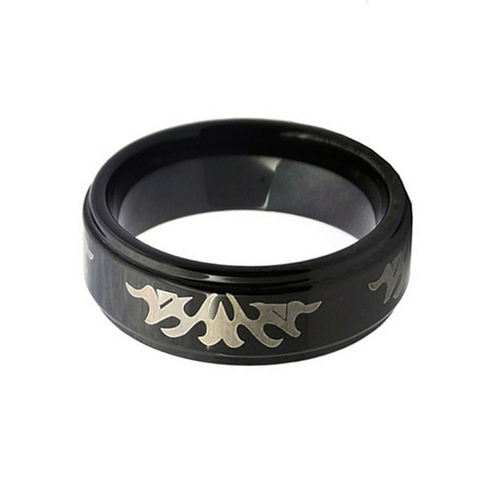 8mm laser engraved tungsten carbide wedding band mens womens engagement ring high polished.This beautiful tungsten rings in black has a Llaser flame pattern design and is silver bevel edge 8mm in width.Our tungsten carbide rings are scratch proof and keep their shine.