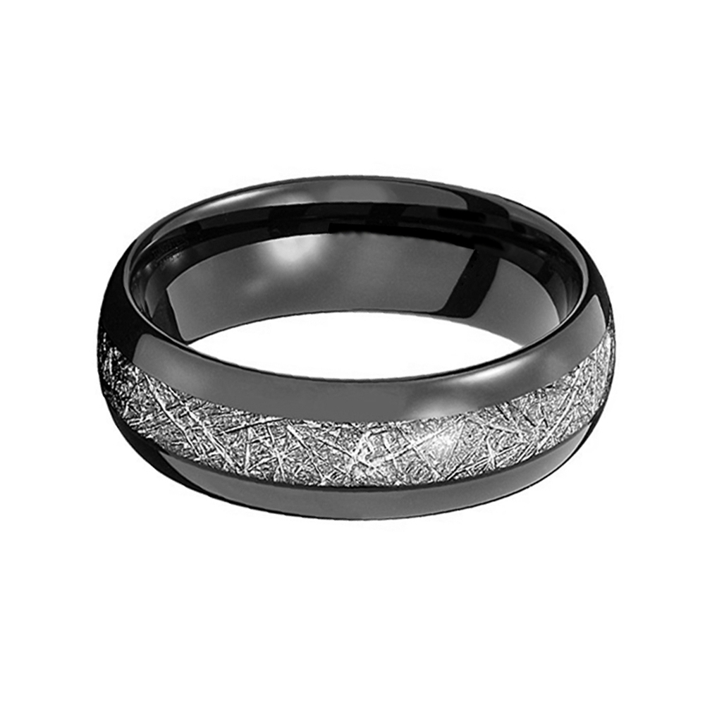 A men's silver meteorite inlay black mens tungsten rings can make for a unique and stylish wedding band or engagement ring. Tungsten carbide is known for its durability, scratch resistance, and hypoallergenic properties, making it an ideal choice for everyday wear. The black color gives the Tungsten Wedding Rings a modern and masculine look, while the silver meteorite inlay adds a touch of elegance and uniqueness to the design. Meteorite inlays are becoming increasingly popular in jewelry design, as they provide a one-of-a-kind pattern that is naturally occurring in the meteorite material. The silver color of the meteorite inlay contrasts beautifully against the black tungsten carbide, creating a striking design that is sure to turn heads.