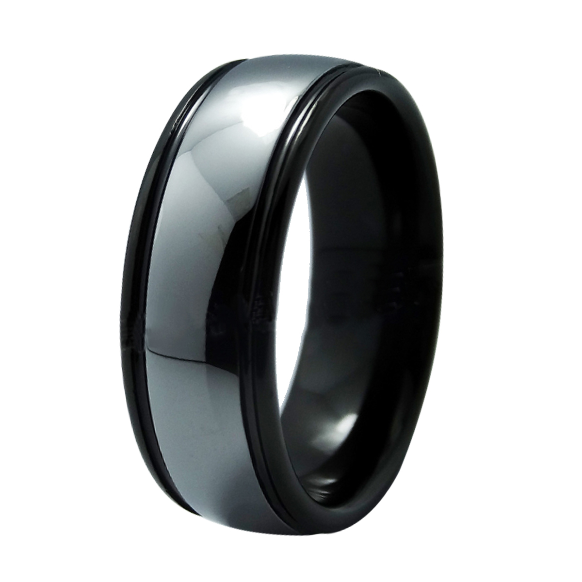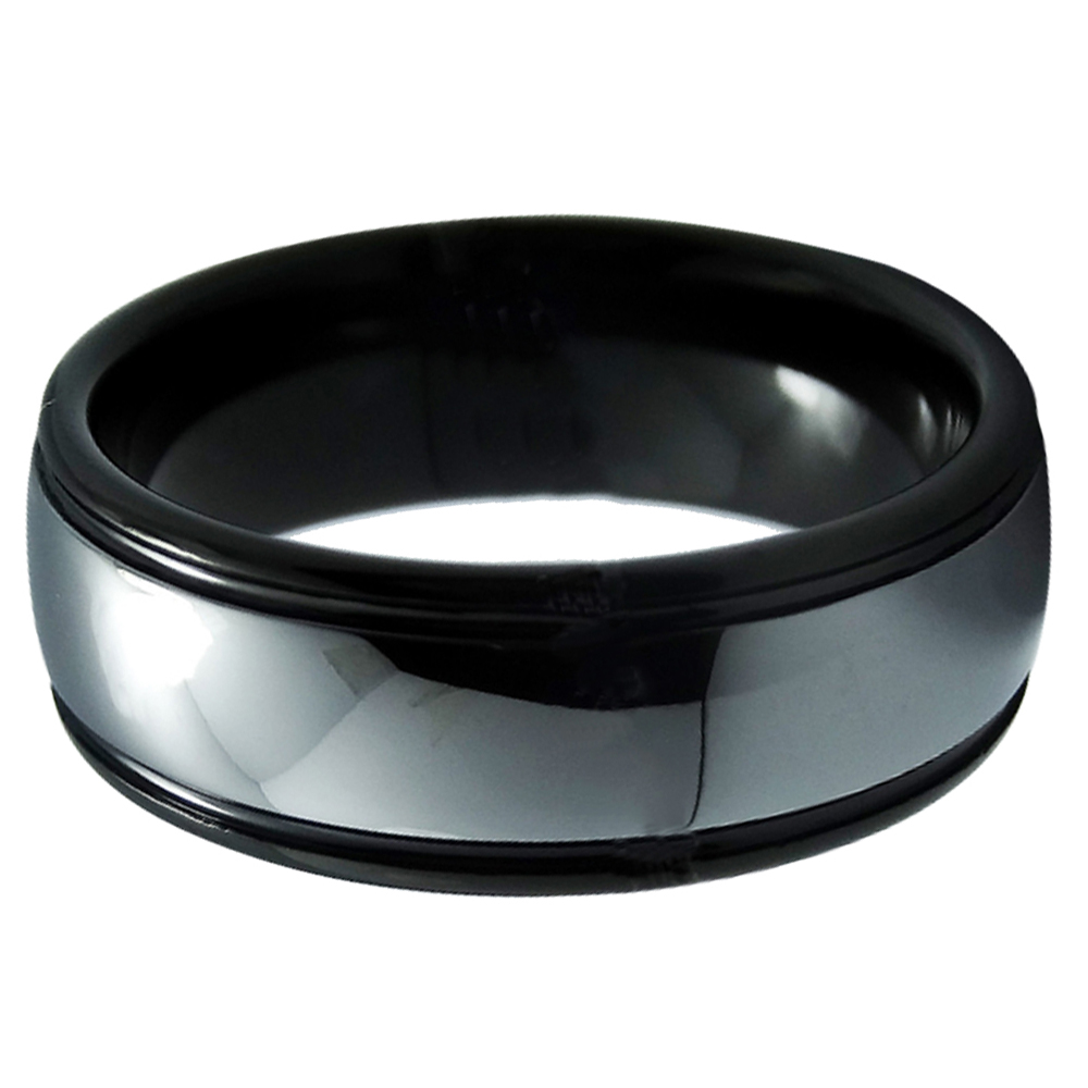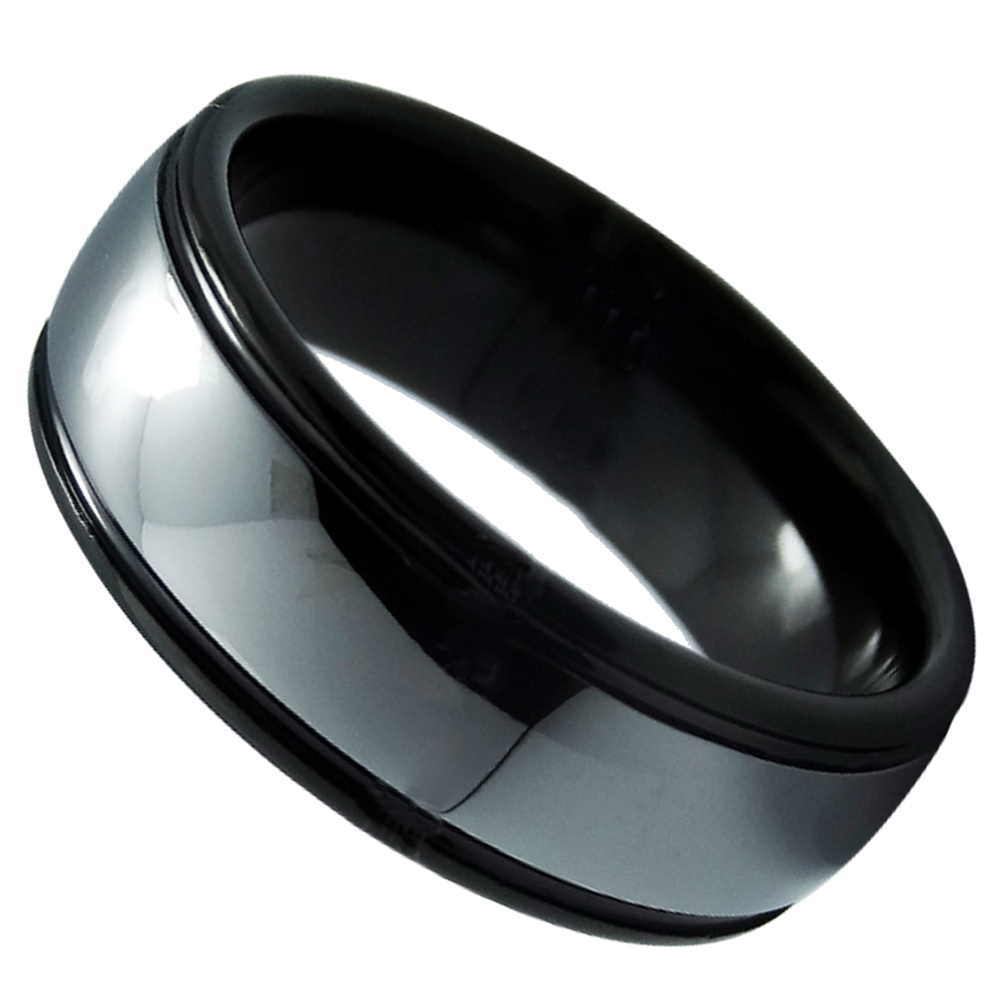 A black cobalt torque band with a glossy finish and a silver cobalt center.Strong,lightweight and unique.Our expert designers craft quality hand finished Titanium rings that endure the test of time.