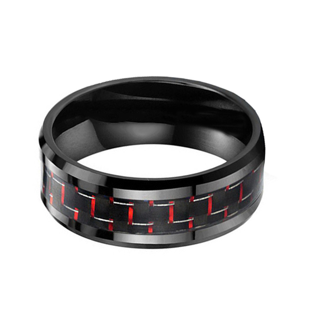Mens black red tungsten wedding band with red and black carbon fiber inlaid through the center of the ring. Outer edges of the ring have been designed with black beveled edges. black tungsten carbide ring 8mm with red carbon fiber inlay. high Quality polished tungsten wedding band, tungsten wedding ring or anniversary ring for men.