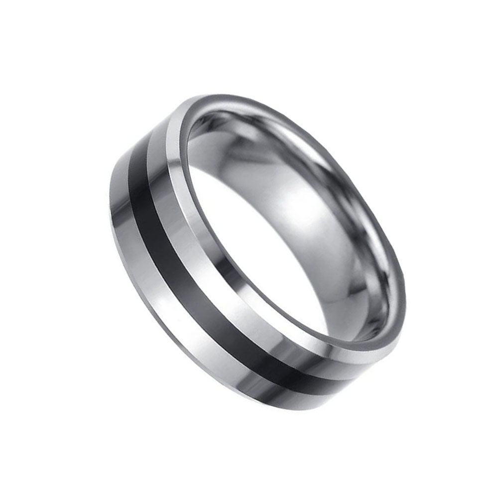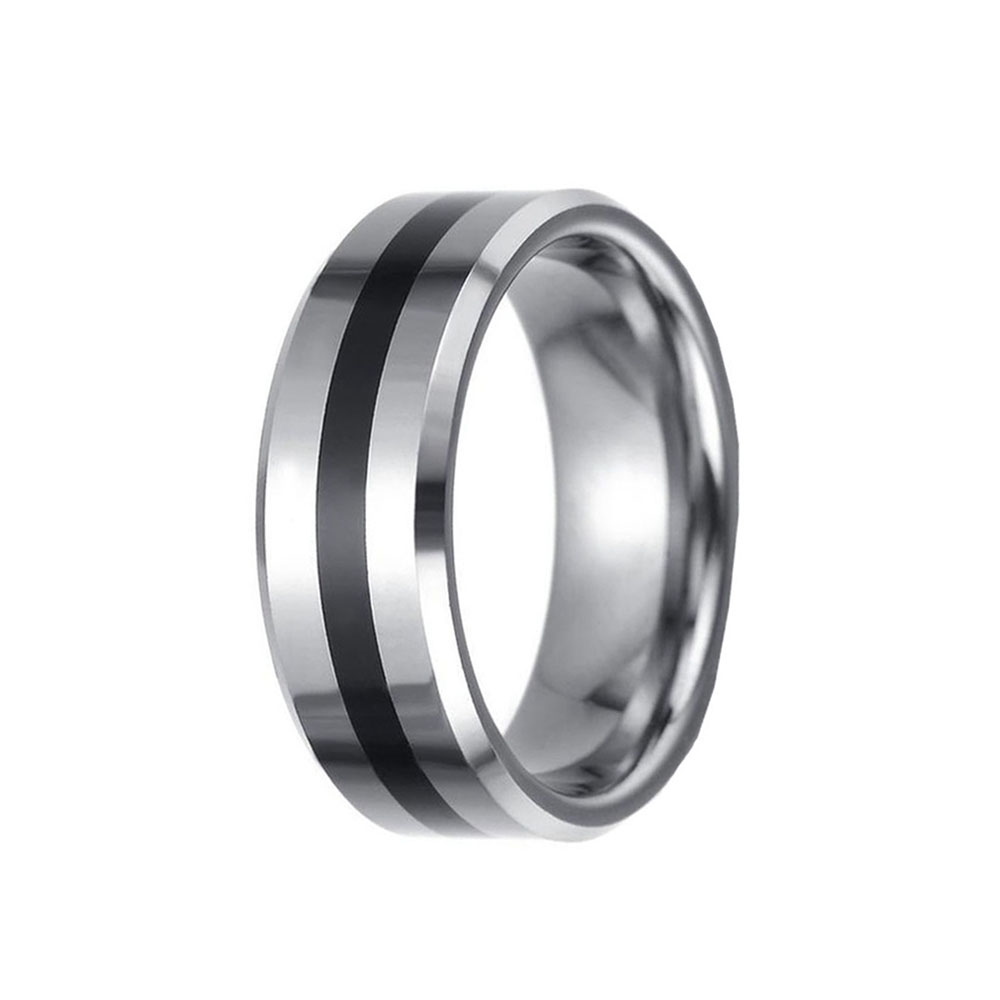 Black shiny polished center high polished silver color beveled edge tungsten carbide wedding ring.Tungsten carbide is scratch resists material. Tungsten can take day to day beating and it can still look the same after couple years.