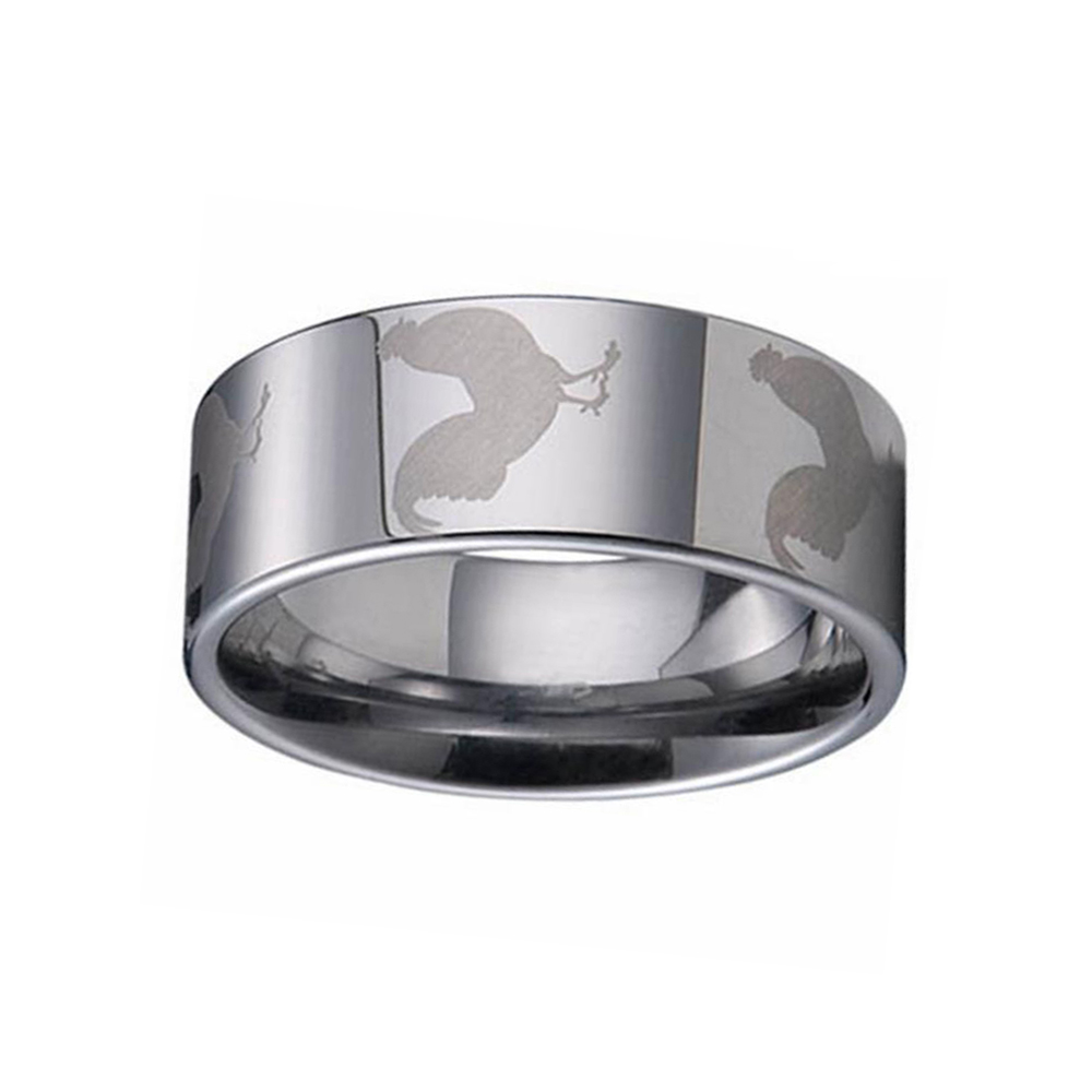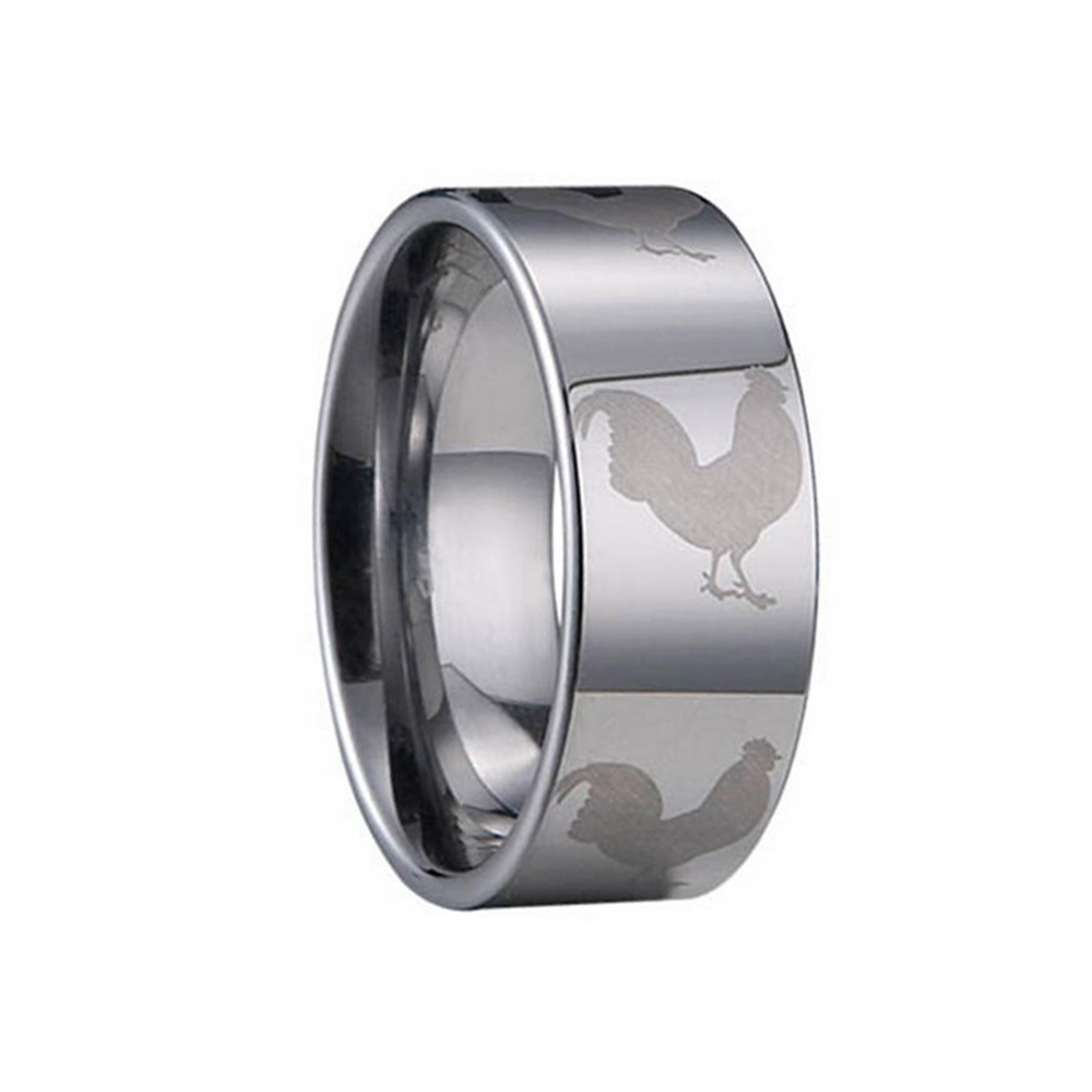 Special Mark laser engraving Flat and high polished surface Tungsten Ring 8mm for men.A classic flat tungsten carbide ring with a special laser design is a ring for men.Carefully create quality assurance.Laser engraving zodiac cock animal patterns make the mens tungsten rings special.This ring is polished to a bright shine, fulfills the requirements of individuals with interest in glossy rings.