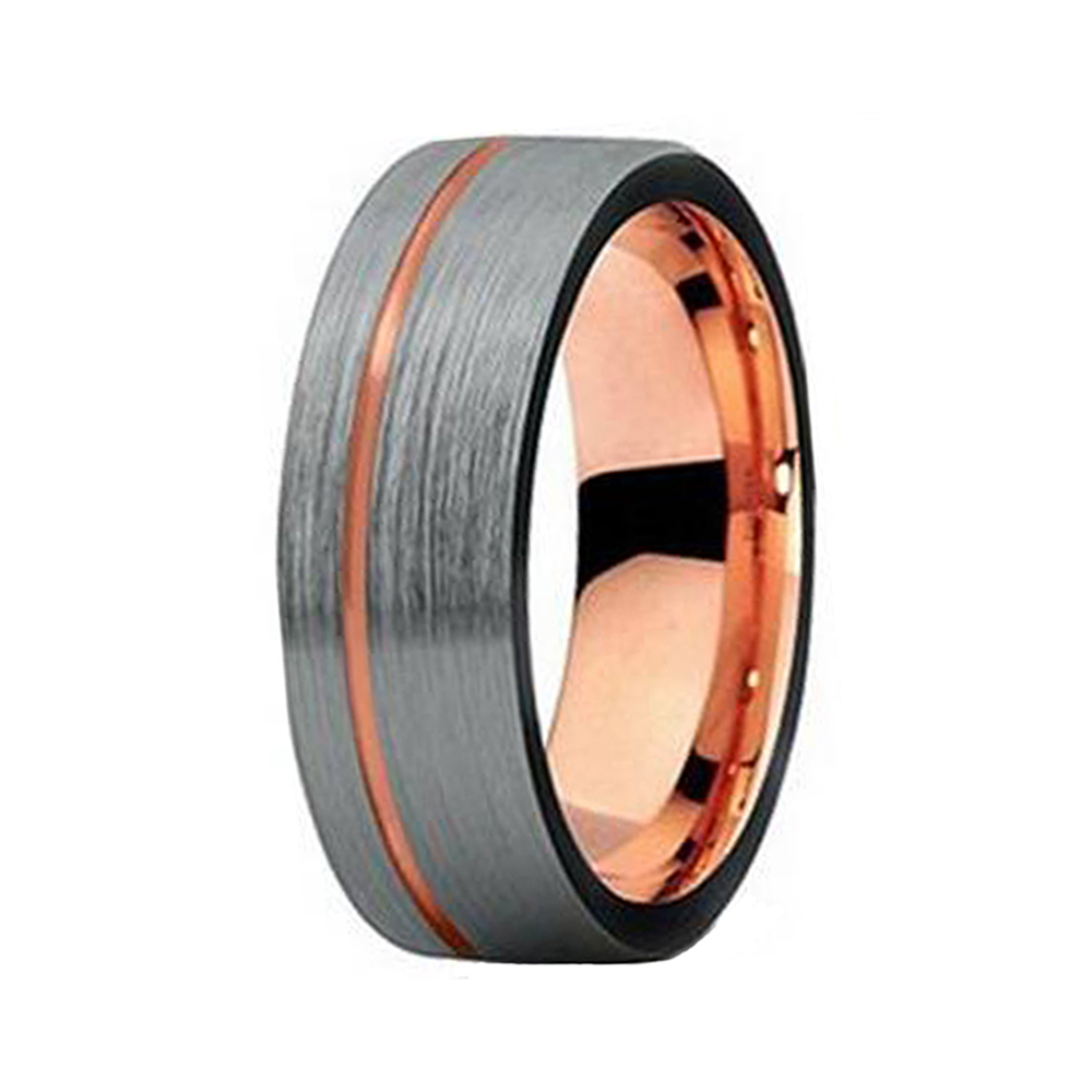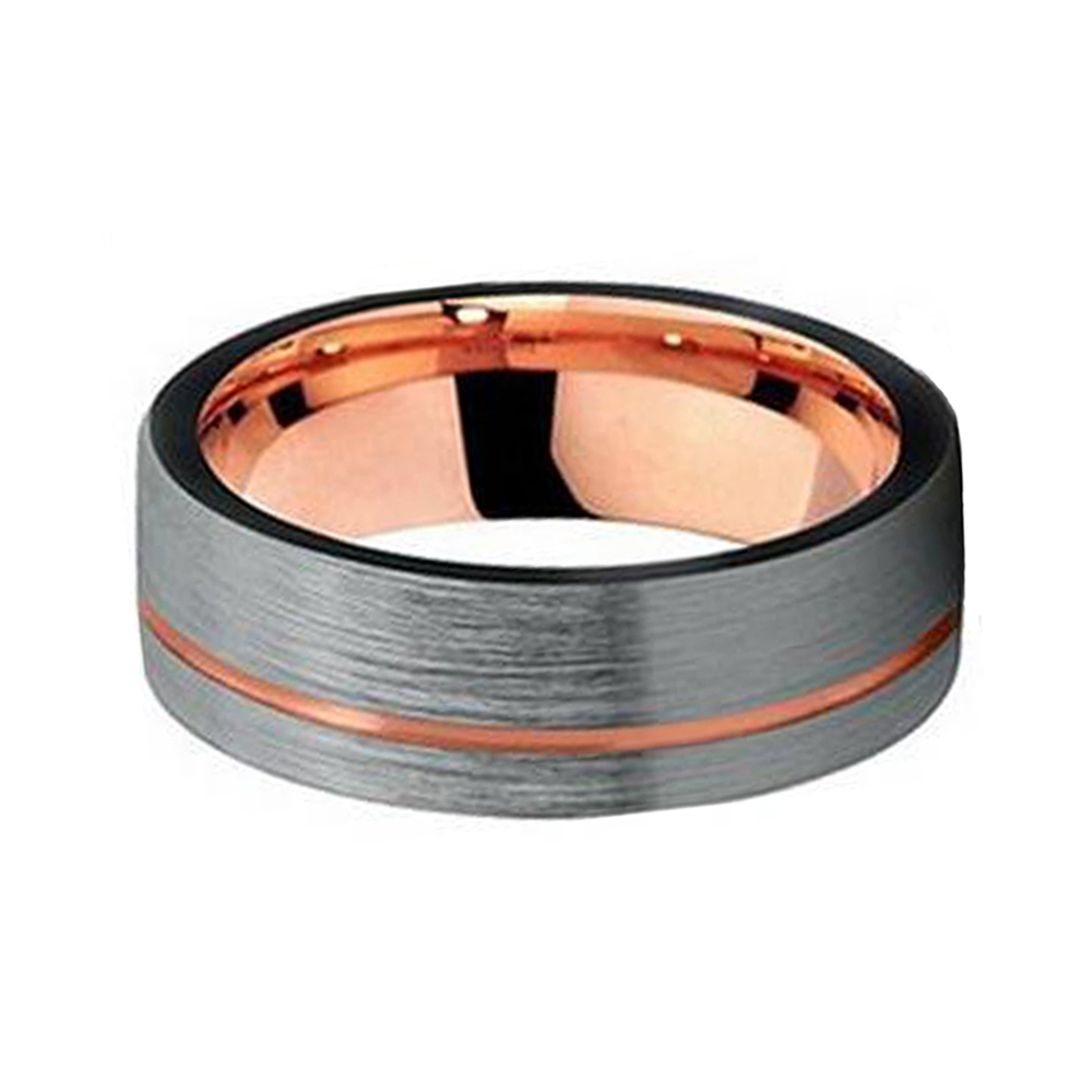 8mm rose gold tungsten carbide ring gray brushed bottom offset line rose gold color tungsten wedding band.This tungstun rings custom is made of high grade tungsten carbide which bind and cobalt free which offers resistant to scratching to keep its surface looking sleek and unblemished for years.Rose gold brushed tungsten ring thin side groove flat edge comfort fit,this ring offers a classy and masculine touch with comfortable wearing experience.