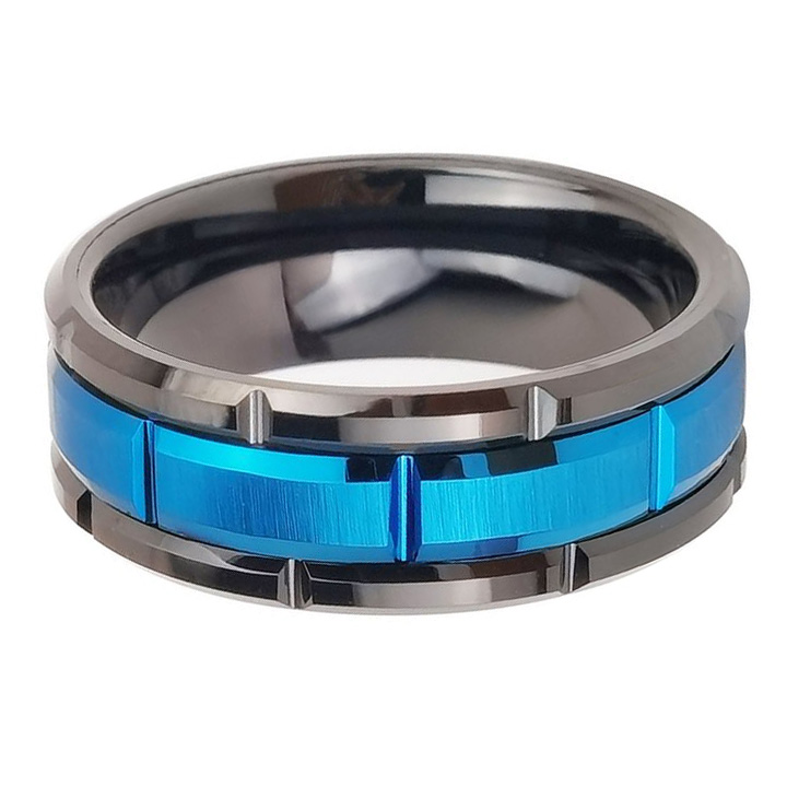 Perfect 8mm width matte finish, blue plated groove, beveled edge tungsten carbide wedding ring