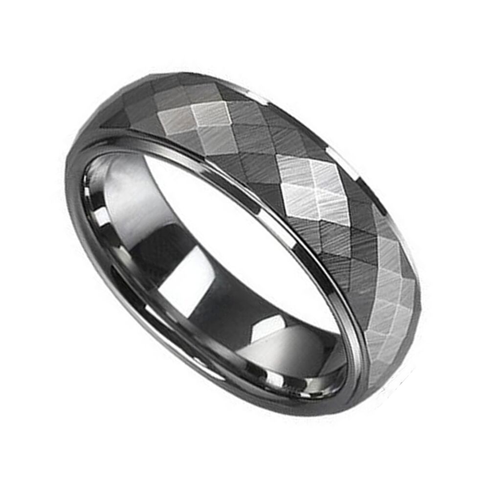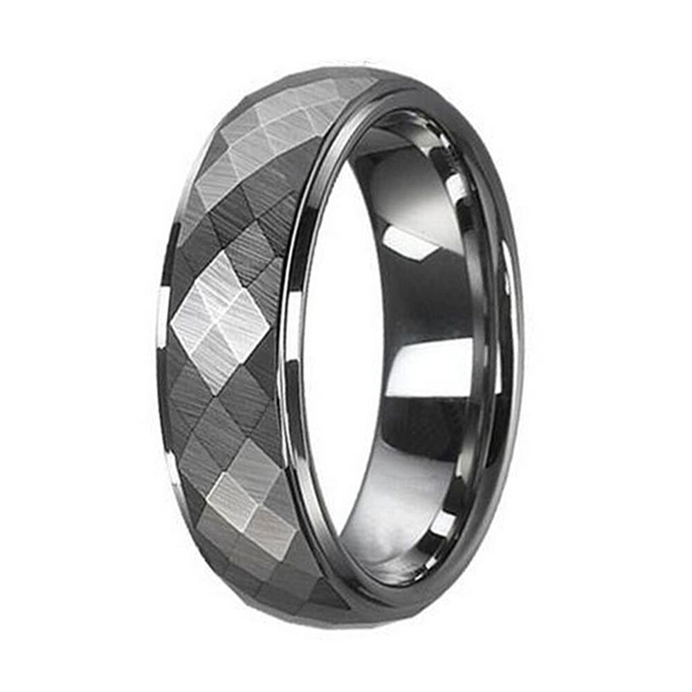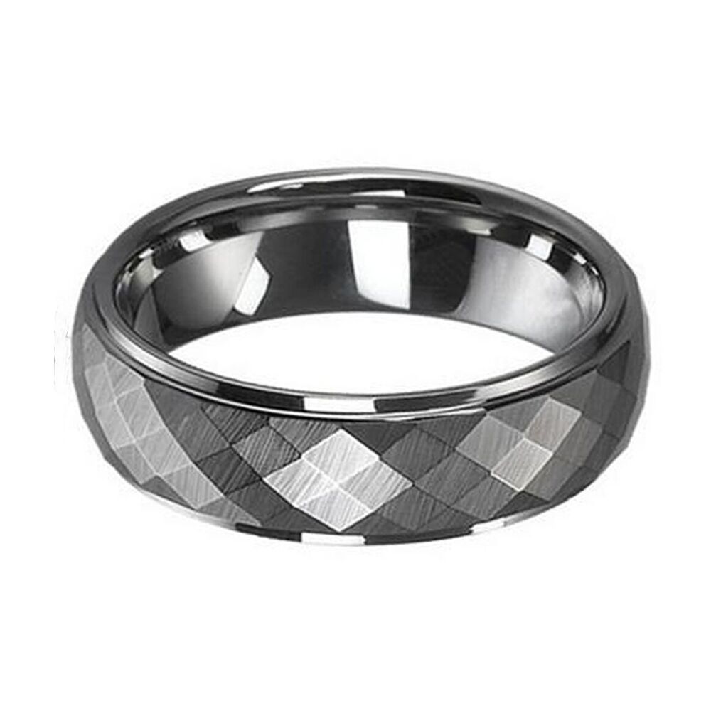 This ring is cut in rhombus and polished at the stepped edges. If you are looking for a ring that is scratch resistant and durable, then our tungsten carbide rings are for you. Tungsten carbide rings are virtually indestructible and scratch proof. They are polished with a diamond compound, resulting in a polish and shine that will last forever.