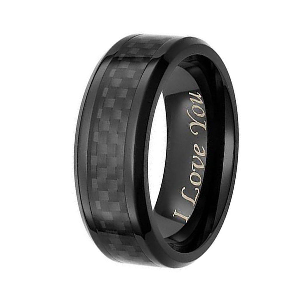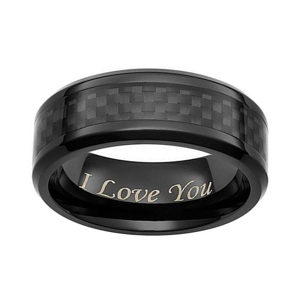Black carbon fiber embraces the center of this men’s wedding ring, giving it an unforgettable look. Finely molded in black titanium,The words "I love you" are engraved on the ring. this mens tungsten rings is topped with a sleek polished finish and its beveled edges add the perfect amount of detail. This ring is also made with a rounded comfort fit style that promotes an easy slide.