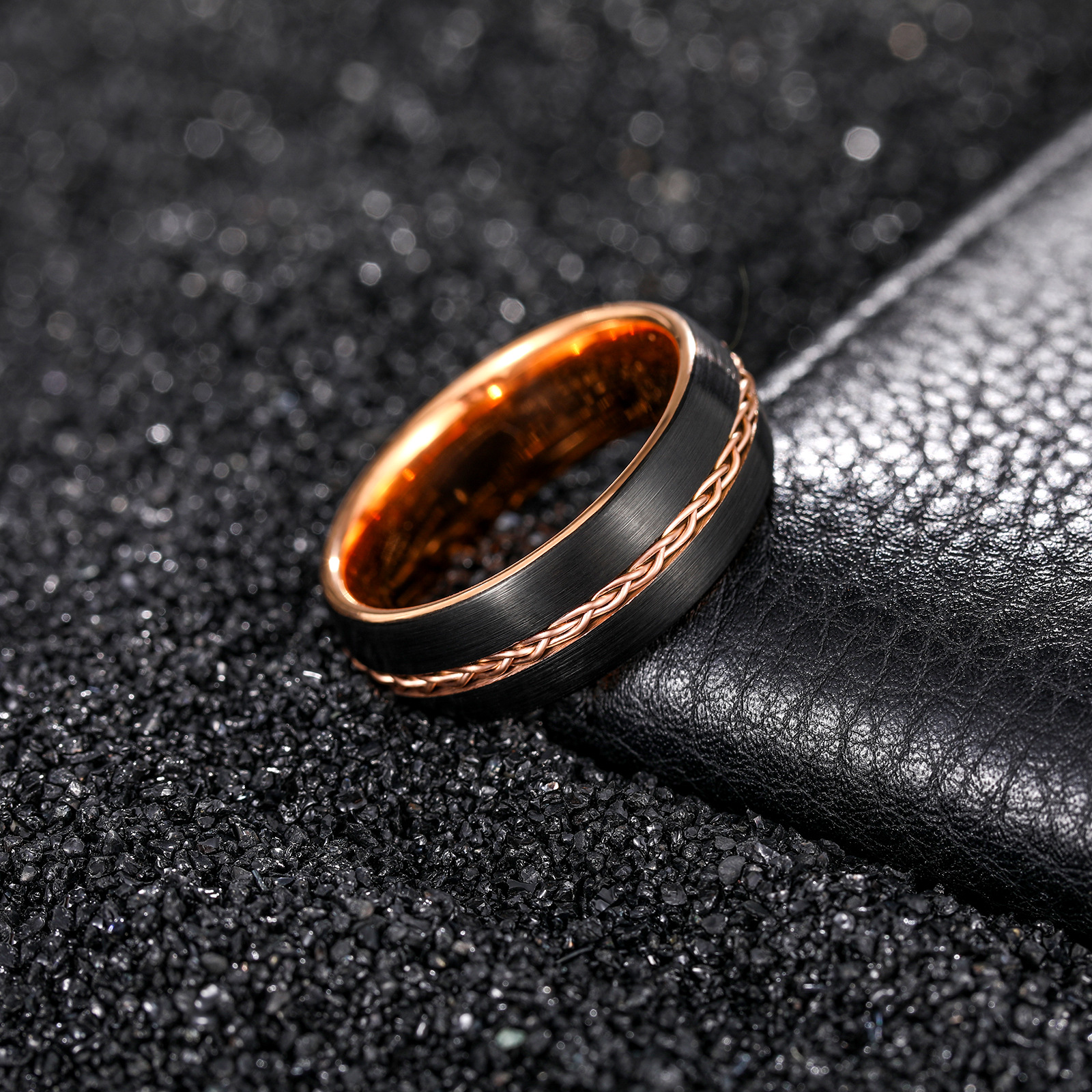 8MM Tungsten Rings Gunmetal Domed with Gold Steel Wire Inlay Line Brushed Surface Men Wedding