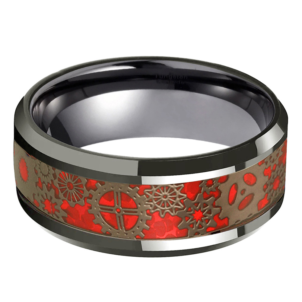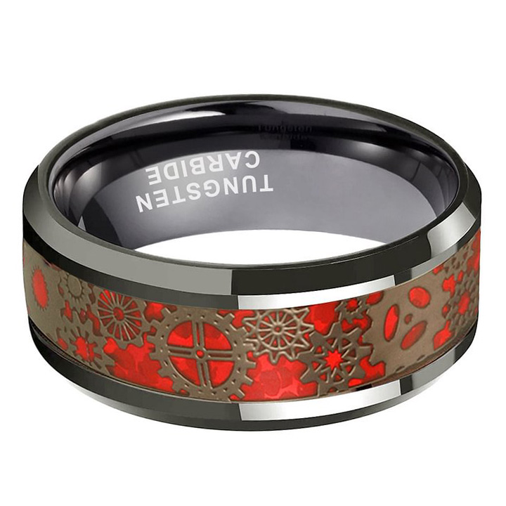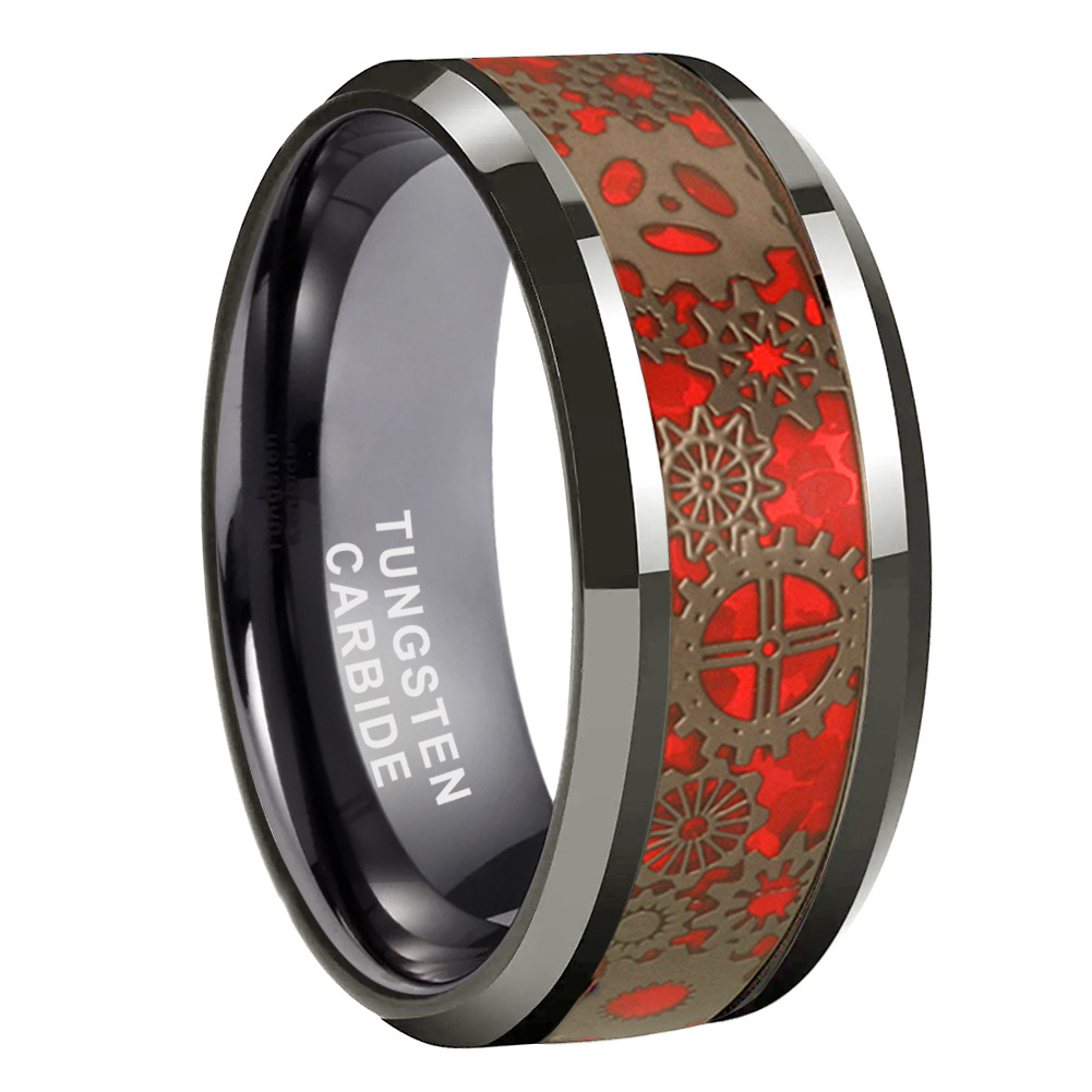 The Women's or Men's Tungsten Carbide Wedding Band Watches Gear Rings with black and rose gold watch gear resin inlay design over blue carbon fiber tungsten ring can be a unique and stylish option for a wedding band. The use of tungsten carbide in the black tungsten rings's construction provides durability and scratch resistance, making it an excellent choice for everyday wear.