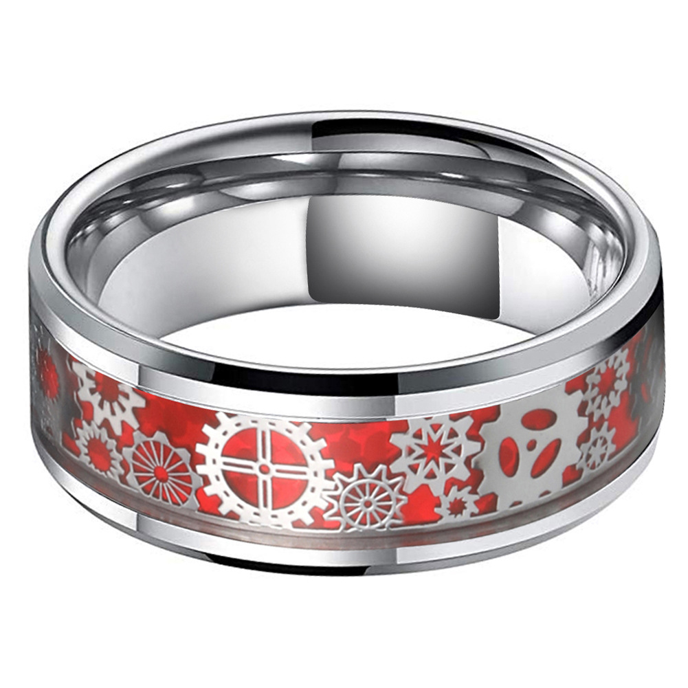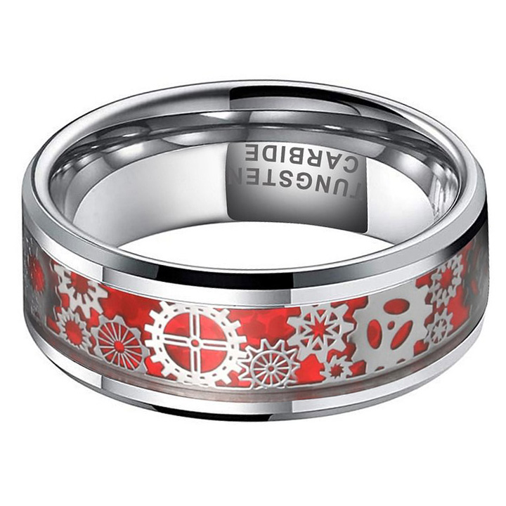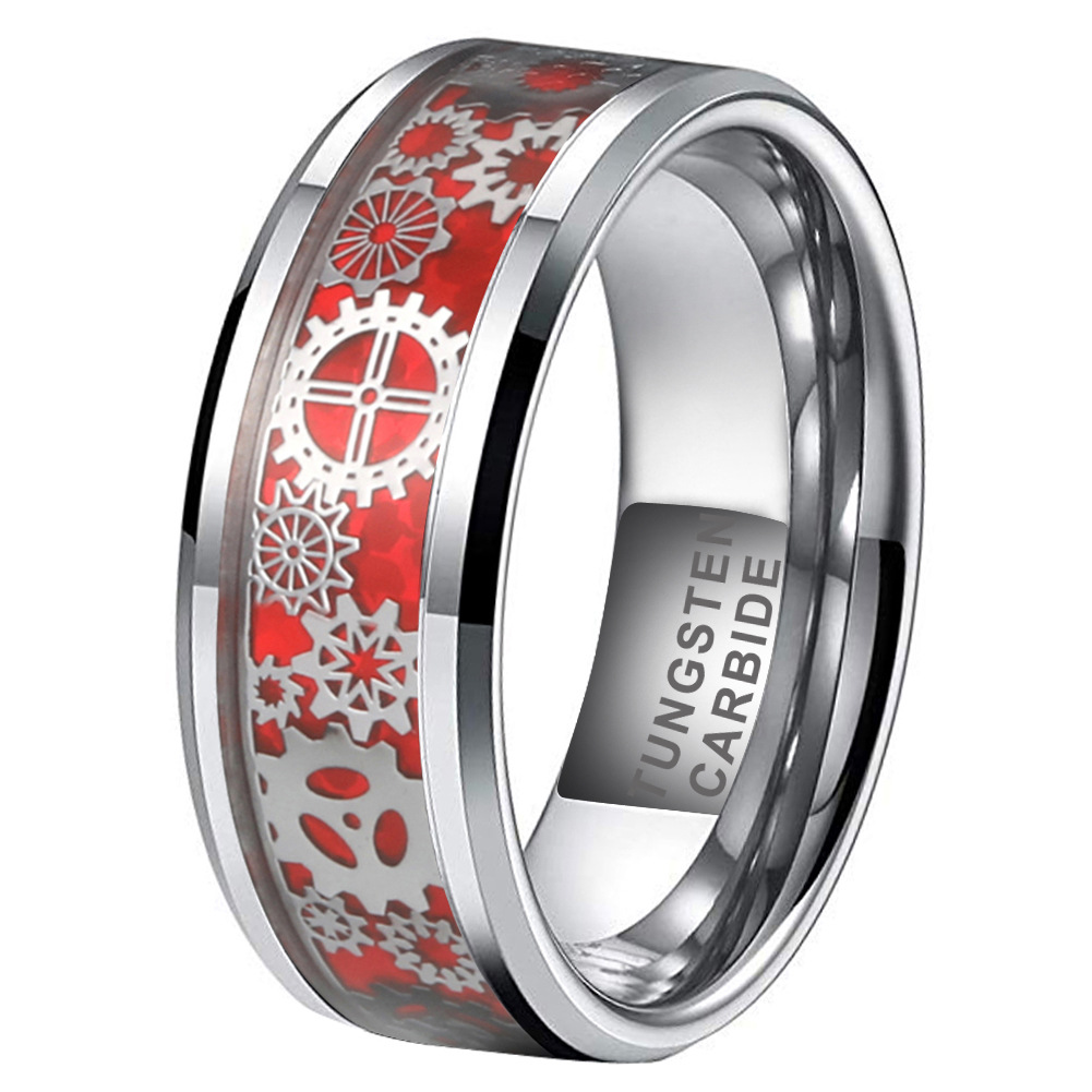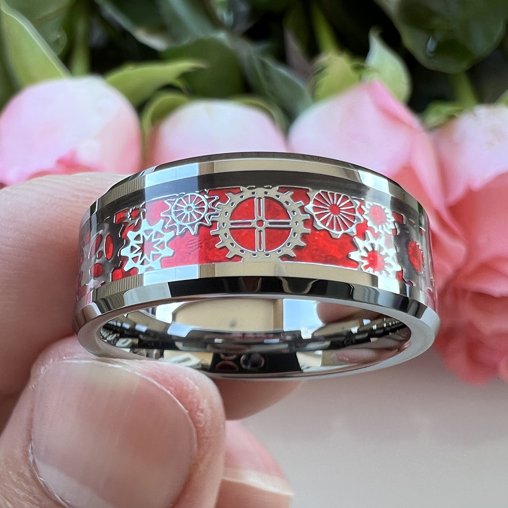 The Women's or Men's Tungsten Carbide Wedding Band Watches Gear Rings with black and rose gold watch gear resin inlay design over blue carbon fiber tungsten ring can be a unique and stylish option for a wedding band. The use of tungsten carbide in the black tungsten rings's construction provides durability and scratch resistance, making it an excellent choice for everyday wear.