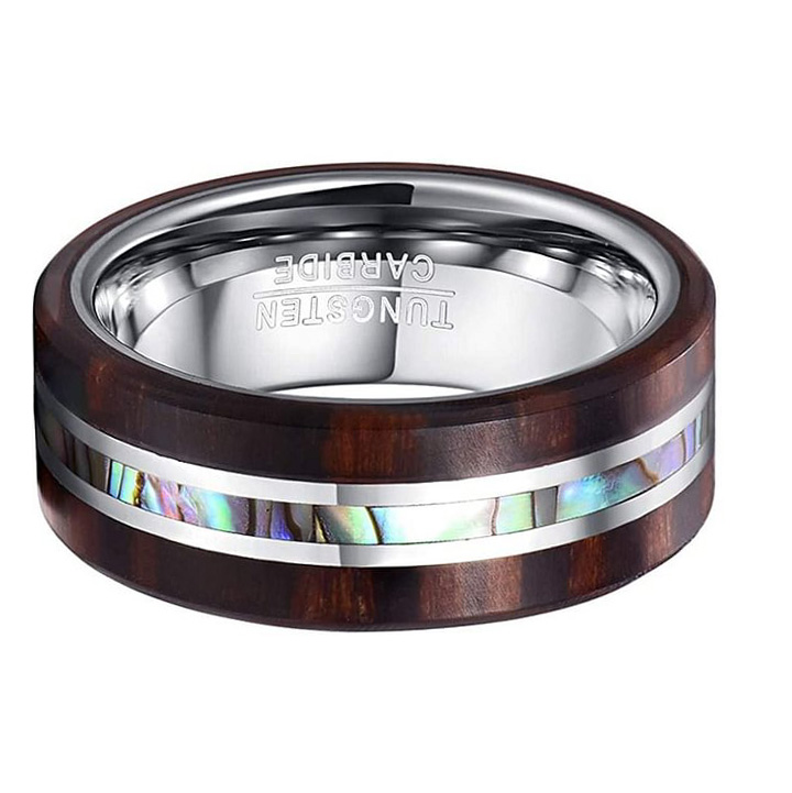 Men's Silver Wood and Abalone Shell Inlay Tungsten Carbide Wedding Band Rings, Flat Edges Ring and Comfort Fit With Mens For Width 8MM