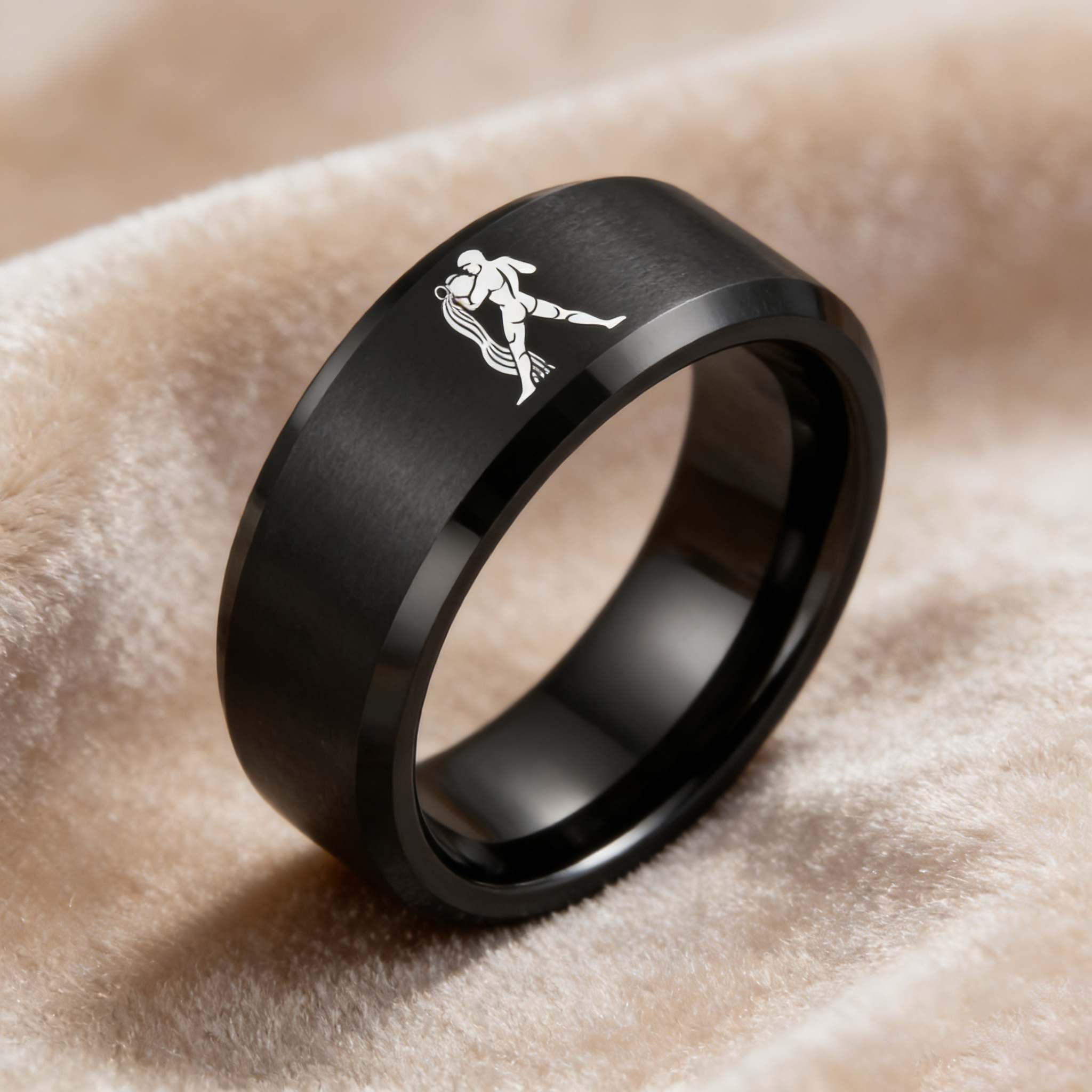 Beveled Edges Black Laser Etched Tungsten Carbide Rings Black Aquarius Couple Wedding Band 4MM 6MM 8MM