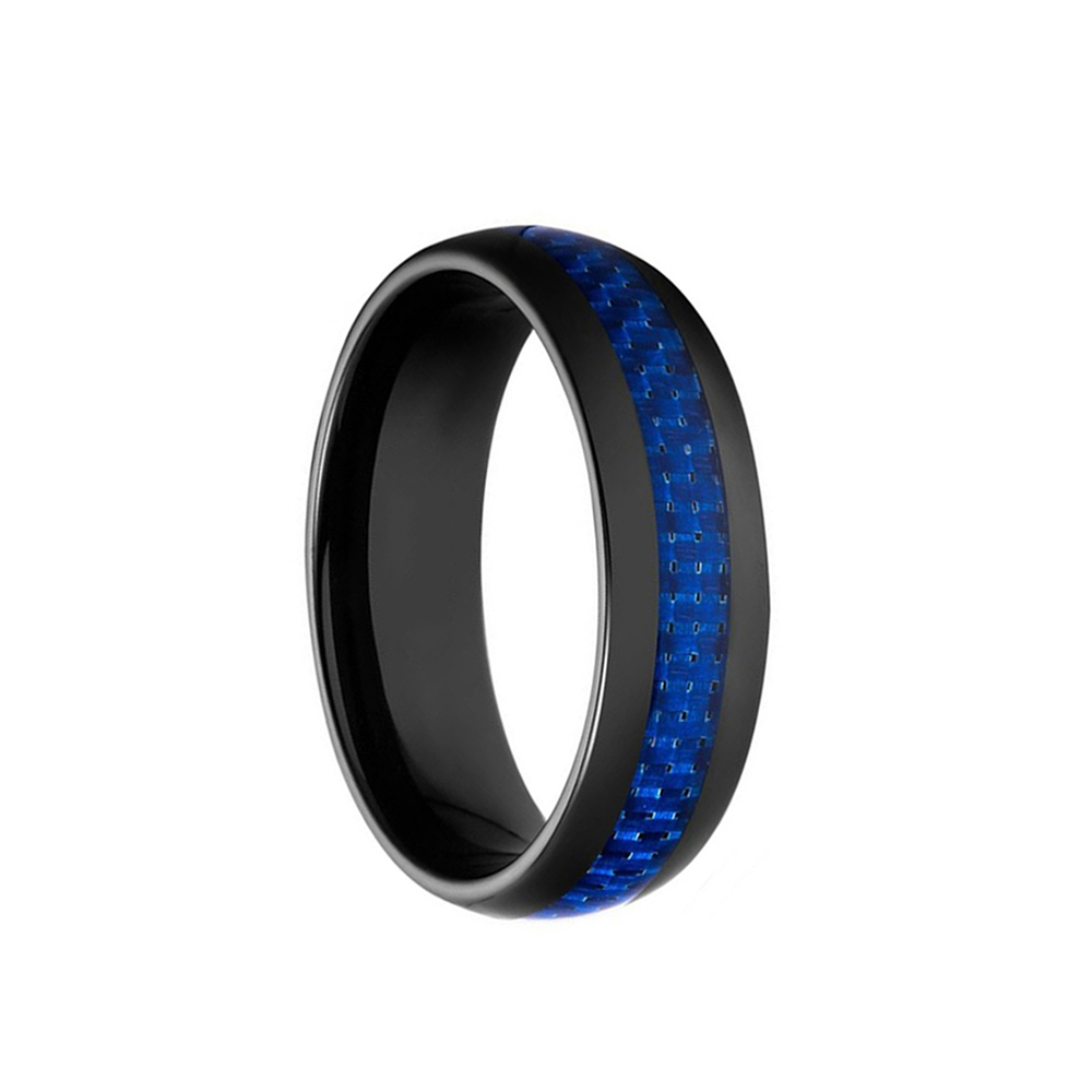 Made from black tungsten carbide,this beautiful 6mm comfort fit wedding ring features a traditional dome shape and blue carbon fiber inlay.Our Blue Line wedding ring is favored by first responders and anyone who likes unique look of blue carbon fiber.