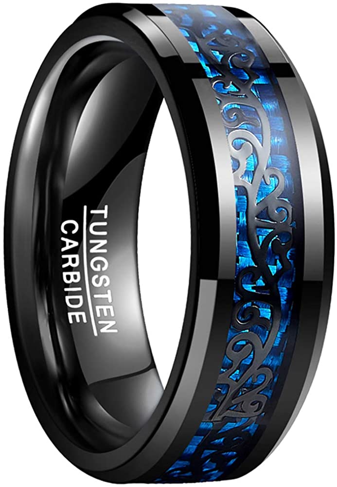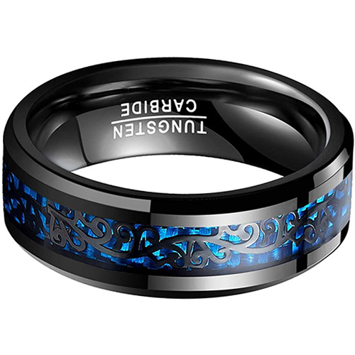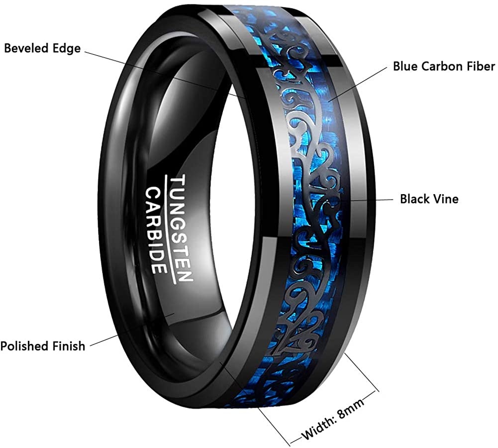 The unique black vine and blue carbon fiber inlay tungsten ring is suitable for both dressy and casual wear, making this a thoughtful gift for him/her.