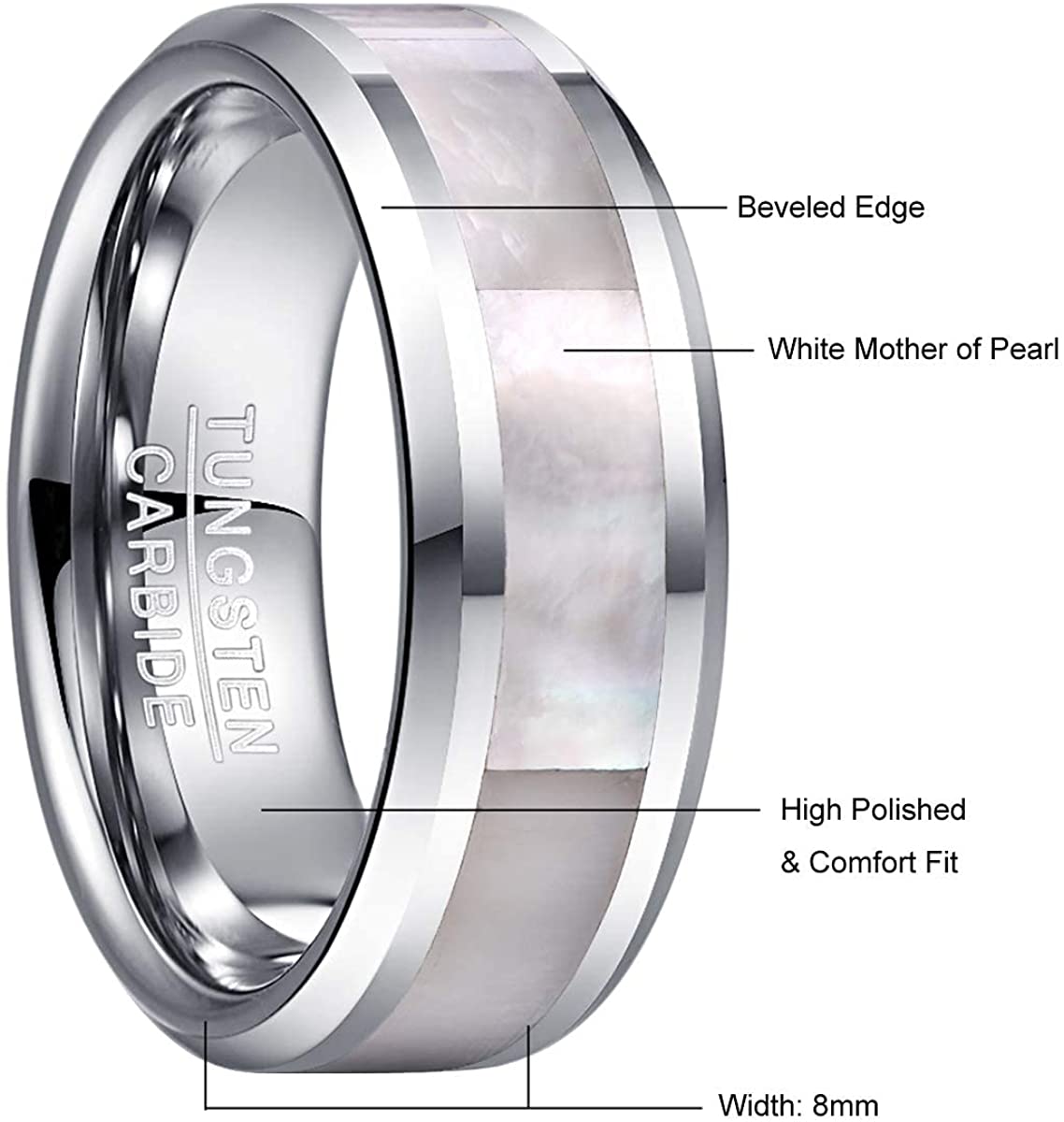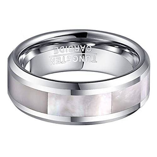 Natural Abalone Shell Mother of Pearl Inlay Tungsten Wedding Band Ring For Mens Womens Beveled Edge Comfort Fit