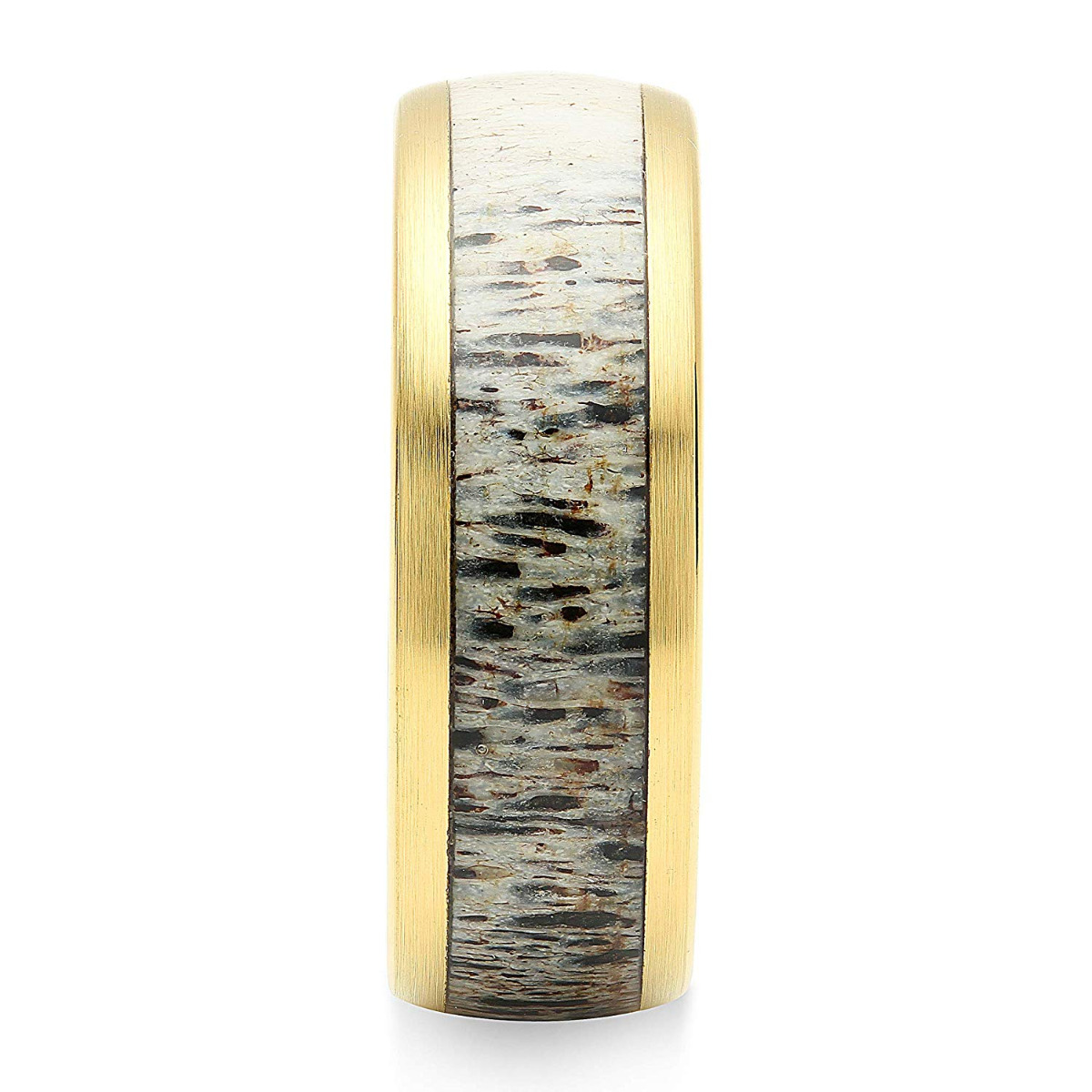 CASUAL AND MODERN Trying not to break the bank but don want a cheap, arcade-looking band for your wedding day? Gold band with antler inlaid dome edge band for a bride or groom offers affordable luxury and provides a traditional, yet modern look without appearing fake or wearing away after a few months. HEAVY DUTY Our wide rings are made with thick, cobalt free tungsten carbide for a classic look that is durable and long-lasting. If youe looking for a wedding bands for men that is tougher, stronger and more scratch resistant than traditional gold or platinum rings, our tungsten rings gold is the choice for you. WATER AND SCRATCH PROOF This 14kt gold plated ring with Antler Inlaid is both scratch resistant & waterproof, so whether you sit at a desk or work with large equipment and heavy machinery, this ring can withstand the elements and continue to look like new overtime. IDEAL SIZING From a small size 8 finger to large size 16 ring fingers, or any half sizes in between, our fancy 8mm band is ideal for a male or female, no matter your hand size. Our aim is to accommodate ring fingers of all shapes and sizes, providing you with a quality band to symbolize your beautiful union. Gold band with antler inlaid for him or her can be used as the original wedding band on your big day, or can function as an ideal travel replacement ring, so you can keep your existing wedding band safe at home when youe on the road or traveling abroad.