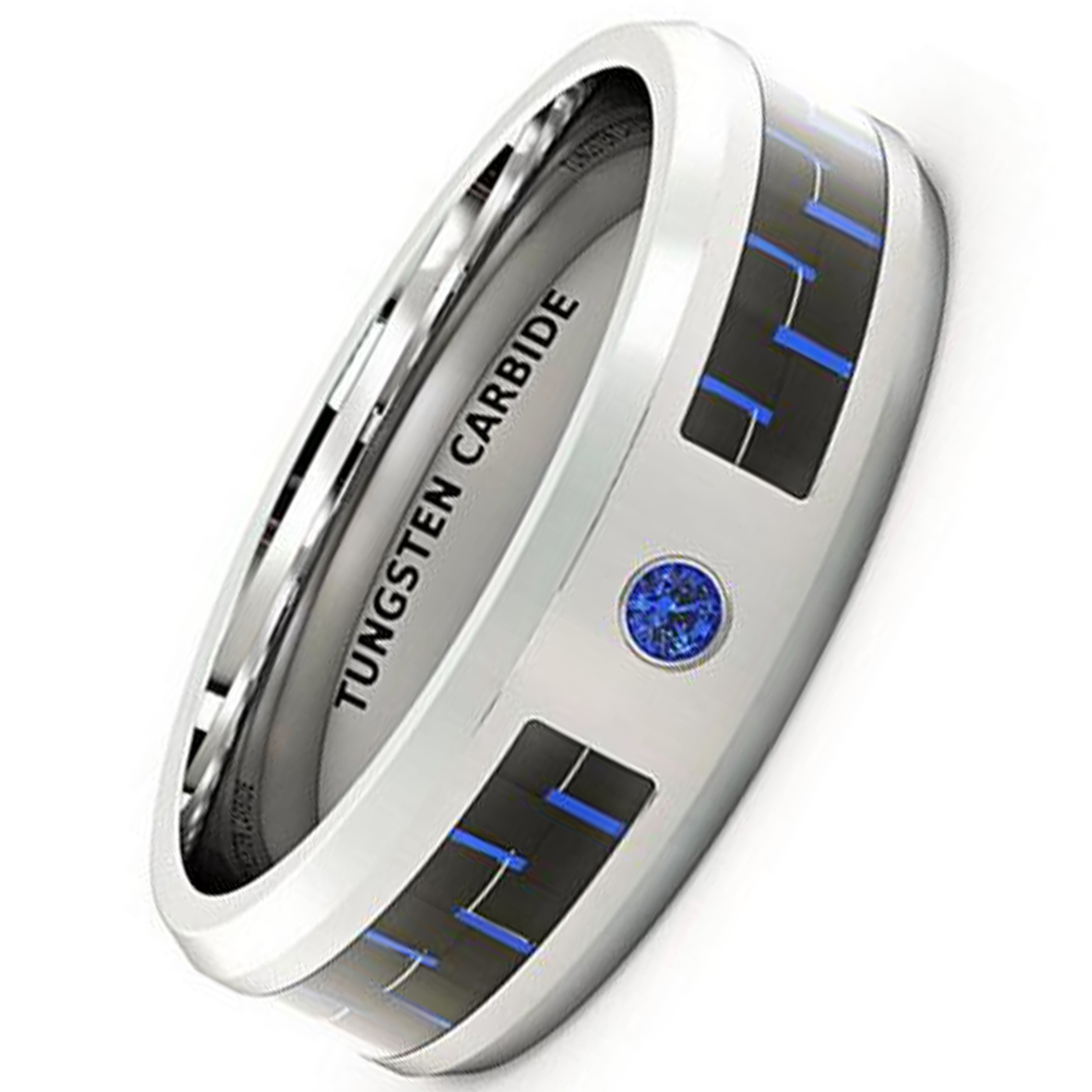 Black and blue carbon fiber inlaid cubic zirconia ring for men's wedding rings.Blue zircon is set in the middle of the ring.Our tungsten carbide jewelry is cobalt free and comfort fit design.Tungsten carbide is the hardest metal and can only be cut by diamond and scratch resistance in its original form.