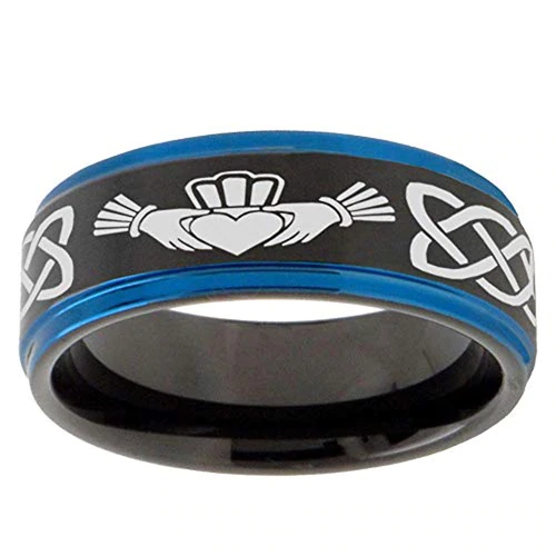 These are various types of wedding bands or rings that are available in different widths and designs. The Men's or Women's Black with Blue Edges Irish Claddagh Tungsten Carbide Embrace Love Heart Wedding Band Rings feature the traditional Claddagh design with a heart and crown symbolizing love and loyalty. The Black with Blue Edges Tungsten Laser Etched Celtic Knot with Heart in Hands Ring is a stylish and unique ring with a Celtic knot pattern and a heart in hands symbol.